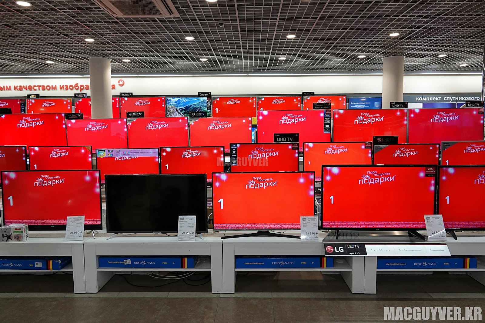 러시아의 TV 진열 방식은 조금 독특하다. 아, 물론 어지러운 진열 방식을 다시 이야기하려는 것은 아니다. 해당 TV 모델의 정보를 종이에 인쇄해서 TV 옆에 붙여두는 국내와 달리, 러시아의 메이저 매장들은 TV 화면 자체에 해당 TV와 관련된 정보를 띄워 두었다.