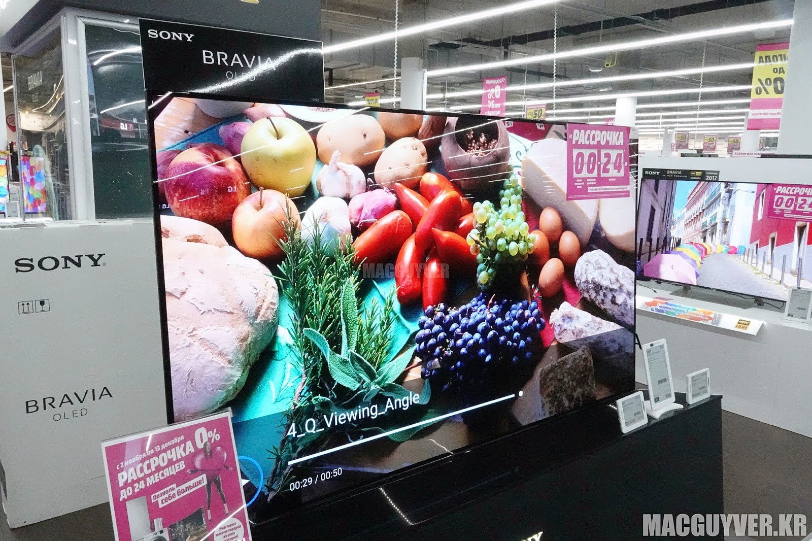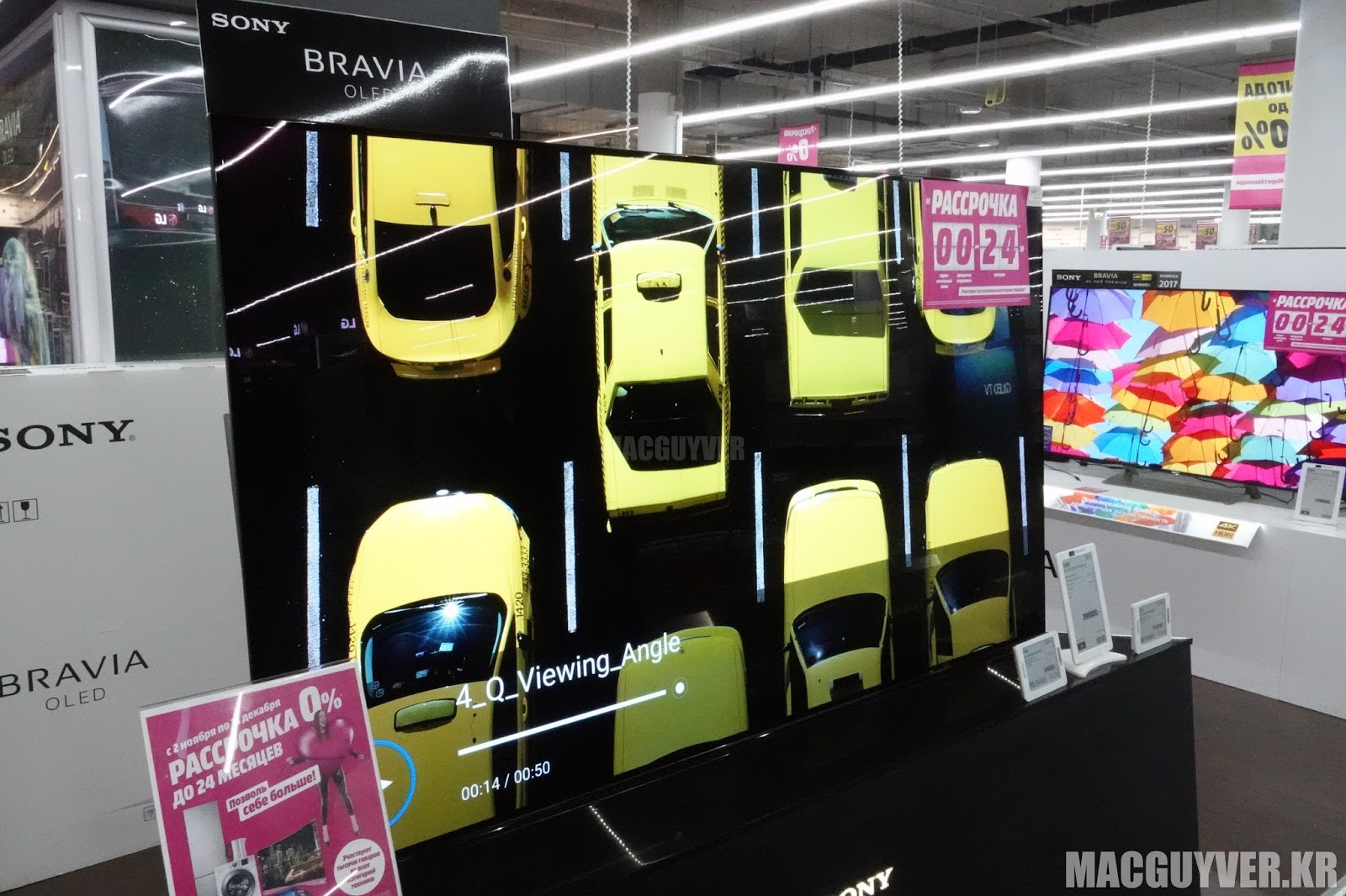 사실 국내는 전시 상품의 교체가 자주 일어나는 편이라 소비자들이 인지하지 못하는 경우가 많은데, 러시아는 조금 다른가 싶었다. 2017년 모델인 소니 OLED TV 화면에 분명 노란색 자동차 사진이 나오는데, 중간에는 초록색으로 보이는 게 아닌가.