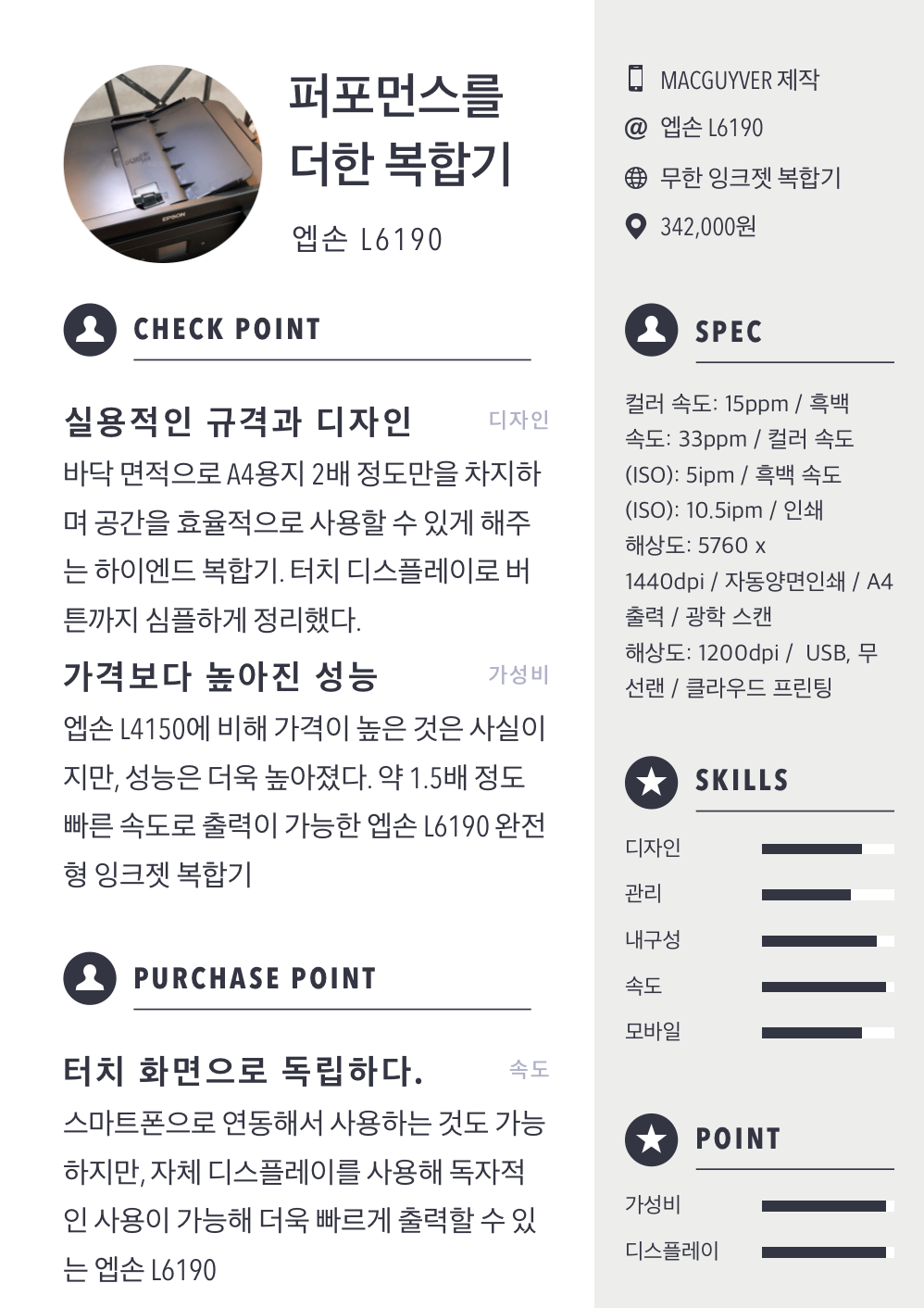 완성형 제품을 찾았다면, 그리고 업무의 효율성을 높이고 싶었다면, 완성형 정품 무한 잉크젯 복합기 엡손 L6190을 고민해보는 것도 좋을 것 같은 이유다. - MACGUYVER.
