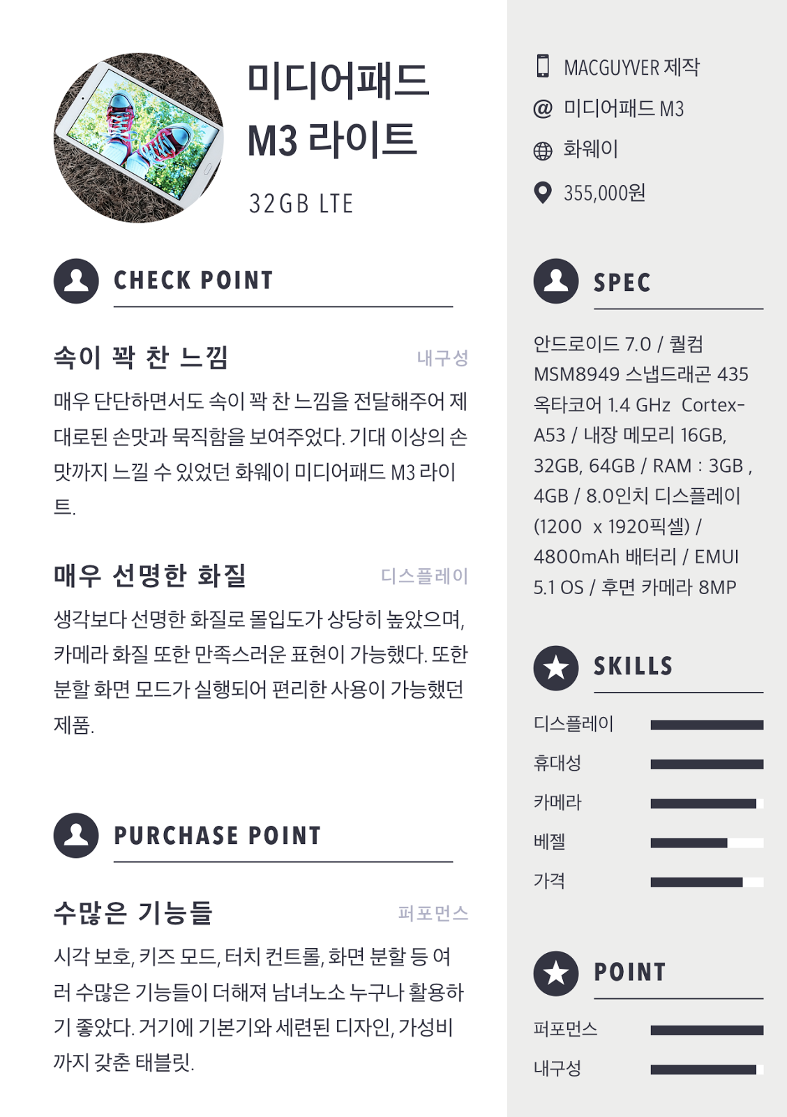 멀티미디어를 즐기고 싶었다면, 또한 가볍게 게임을 즐기거나 가족이 함께 사용할 대화면 기기를 찾고 있었다면 화웨이 미디어패드 M3 라이트 LTE 가성비 태블릿이 좋은 대안이 될 것 같았다. - MACGUYVER.