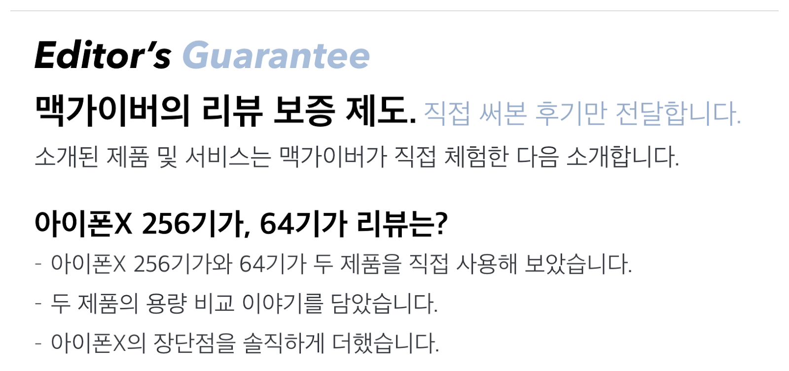 칩셋도, 램도, 화면도, 카메라도 모든 스펙이 동일하다. 단지 저장 가능한 공간에서의 차이가 있다는 점만 기억한다면 자신에게 맞는 합리적인 아이폰X 용량의 모델을 선택할 수 있을 것 같다. - MACGUYVER.