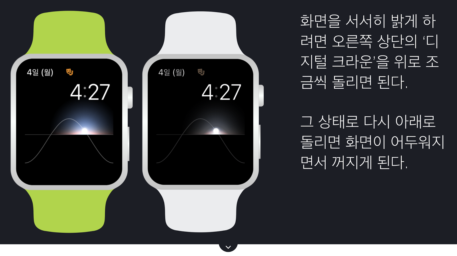 이러한 방법을 활용하면, 굳이 최고 밝기로 화면이 켜지는 것이 아니라, 필요한 만큼만 살짝 깨어나는 애플워치를 발견하게 될 수 있다. 이제, 극장에서든 불빛이 나와서는 안되는 장소에서든 이러한 방법으로 매너 있고 센스 있는 시간 확인을 활용하는 것도 가능하다.