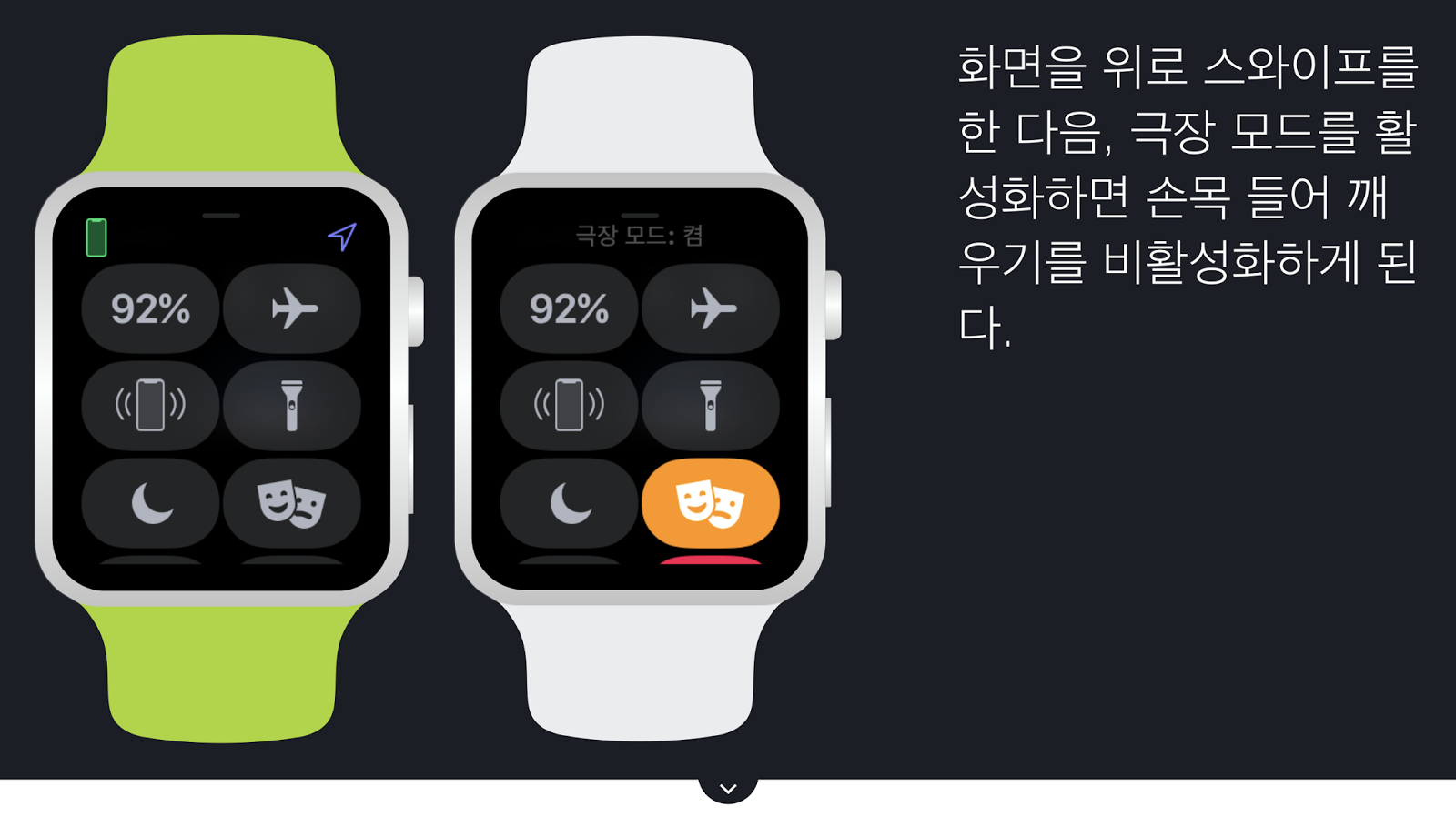물론, 이 방법에 더해서 최신 watchOS에서는 ‘극장 모드’를 지원하기 때문에, 위로 스와이프 해서 극장 모드를 활용하는 방법도 있다. 이때는 손목을 아무리 강하게 들어도 애플워치의 화면이 켜지지 않는다.