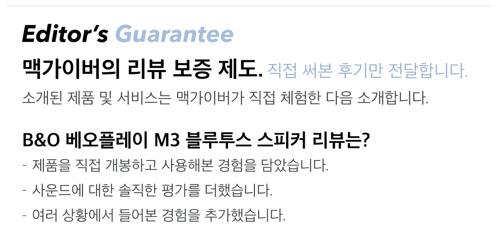 B&O Play를 통해서 공간을 가득 채우는 사운드를 경험하기 위한 비용 또한 다른 B&O 제품 대비 더욱 저렴한 30만원 중후반대라는 점을 감안하자면, 나름대로의 합리적인 가성비 제품이 아닐까 싶은 제품이었다. - MACGUYVER.