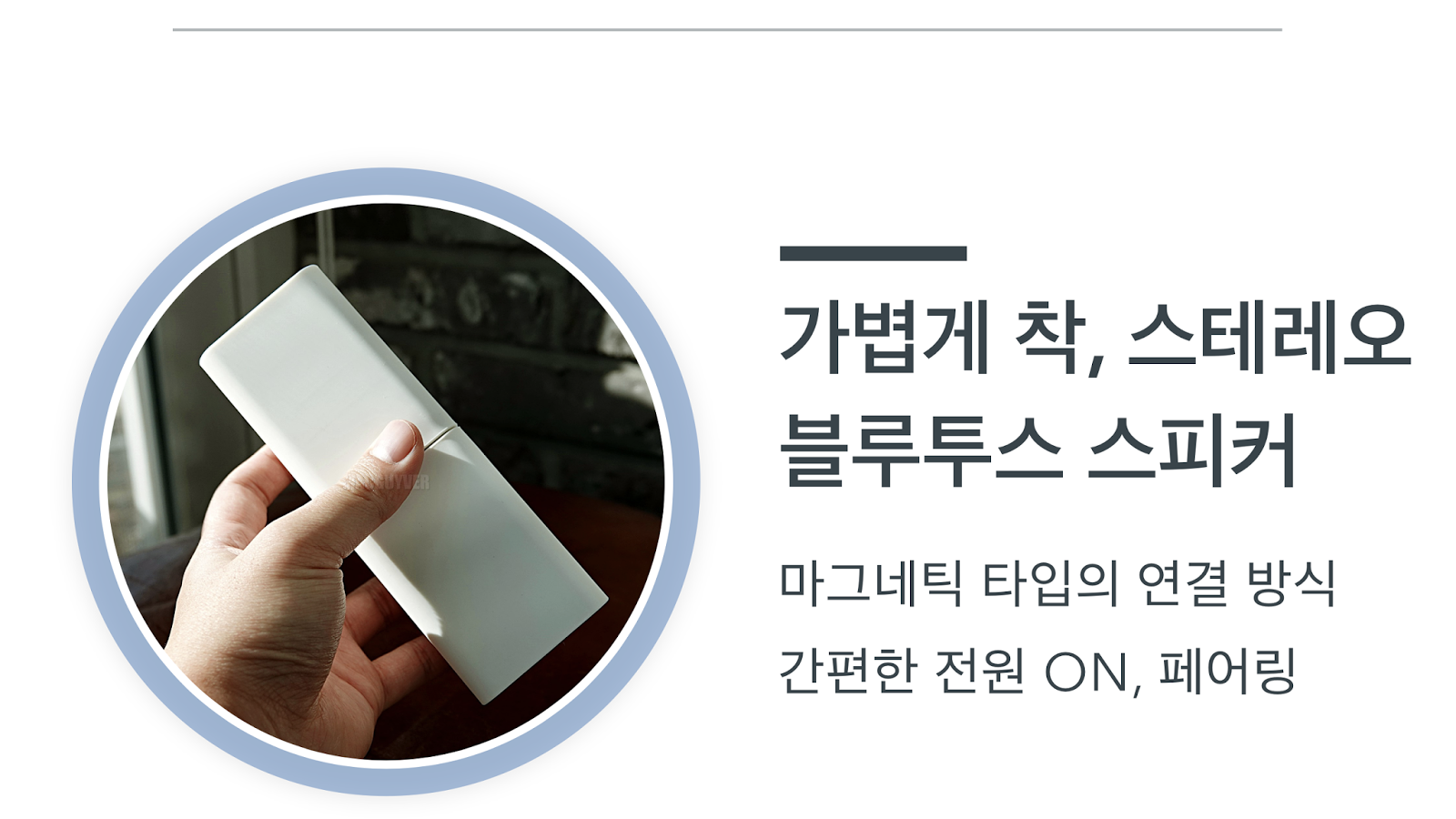 아이리버 사운드 트윈 듀얼 스테레오 블루투스 스피커는 마그네틱 타입으로 강력하게 연결되어 있는 좌우 스피커를 가볍게 분리하는 동작만으로도 전원을 켜고, 페어링이 되기 때문에 편리한 사용자 경험을 제공해준다.