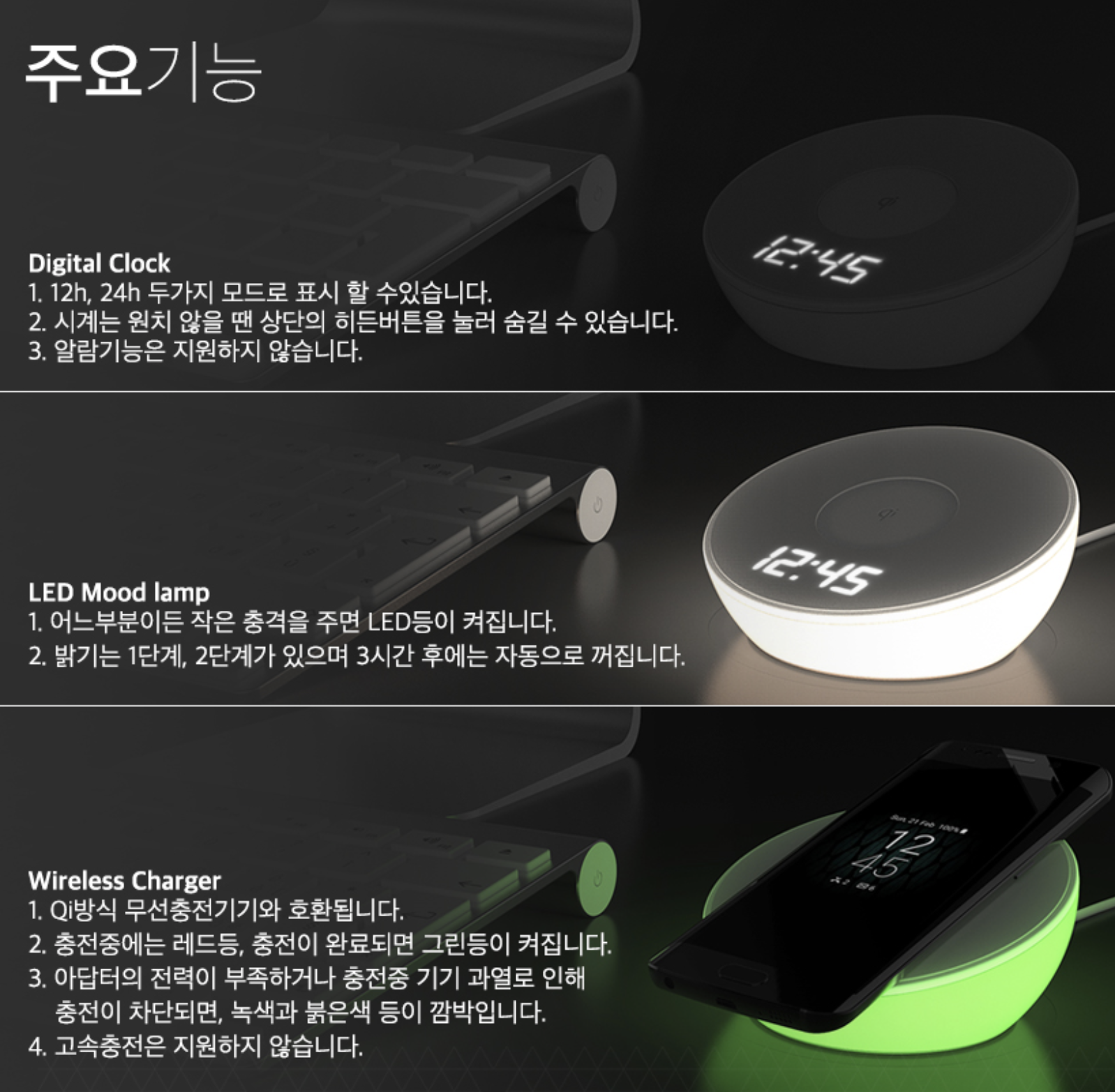 결과 오블리크 제로 LED 무선충전기는 적당한 각도로 기울어져 있어서 스마트폰에 나타나는 알림이나 표시들을 쉽게 보는 것도 가능했고, 무선 충전을 사용하지 않을 경우에도 시간을 보여주거나, 무드등으로서의 역할, 유선 충전 단자까지 제공해서 다재다능한 모습을 보여줬다.