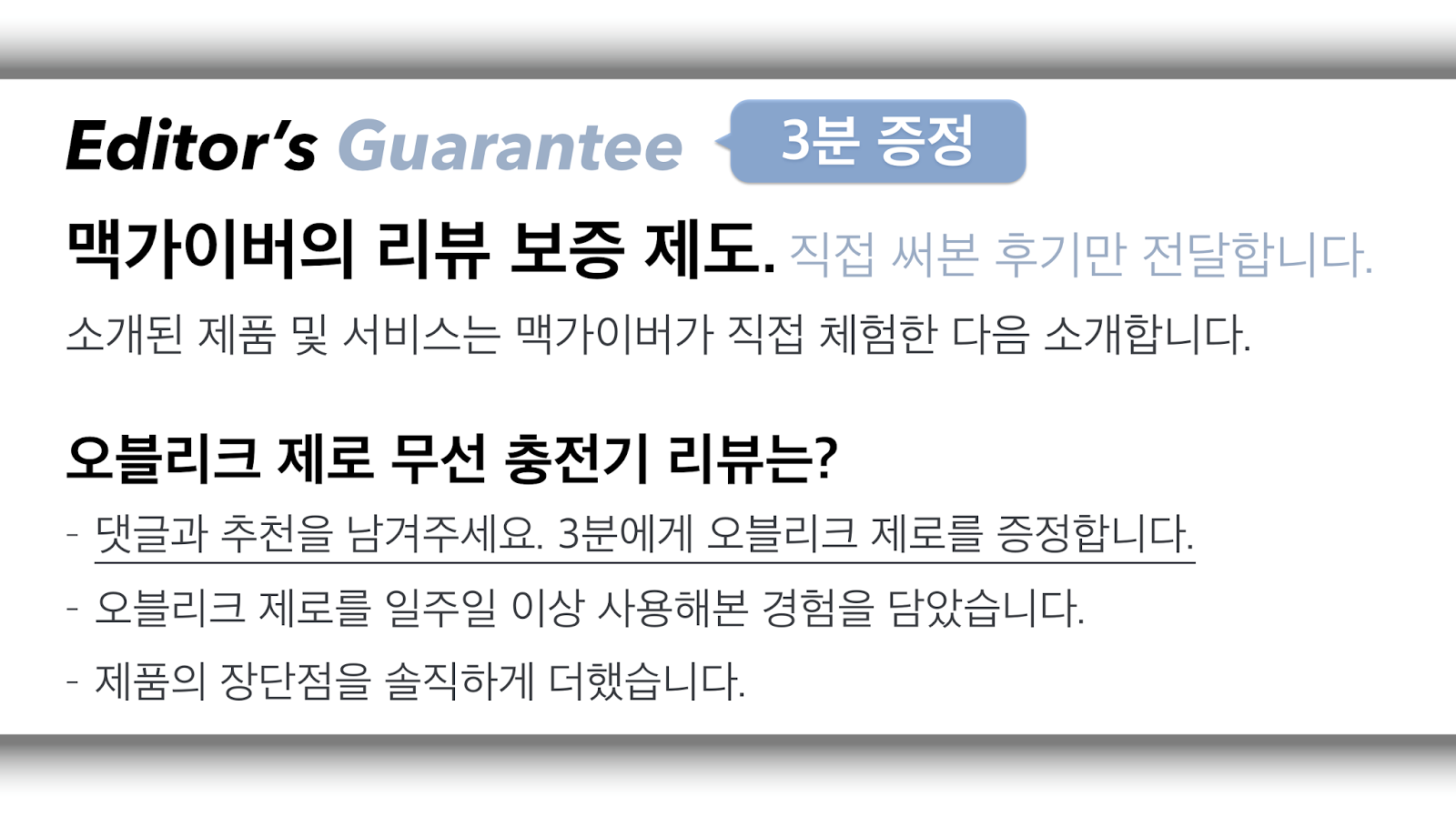 물론, 무선 충전을 지원하는 스마트기기가 없다면 굳이 오블리크 제로 LED 무선충전기를 선택할 필요는 없겠지만, 무선 충전이 가능한 제품을 사용하고 있고, 무선 충전기를 필요로 하는 분들이라면 인테리어 효과 및 실용성까지 겸비한 오블리크 제로 LED 무선충전기를 고민해보는 것도 좋을 것 같았다.