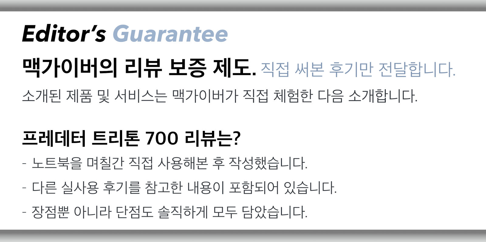 그래서 트리톤 700은 트랙패드와 키보드의 위치를 바꿔버렸는데, 덕분에 게임 중에 오터치를 하거나, 타이핑 중에 마우스 커서가 튀는 일이 있을 수가 없었다. 하지만 게임 외의 용도로 트랙패드를 사용하게 될 때는 다소 어색한 느낌이 들기도 했고, 키보드를 잘못 누르는 일도 있을 것 같았다.