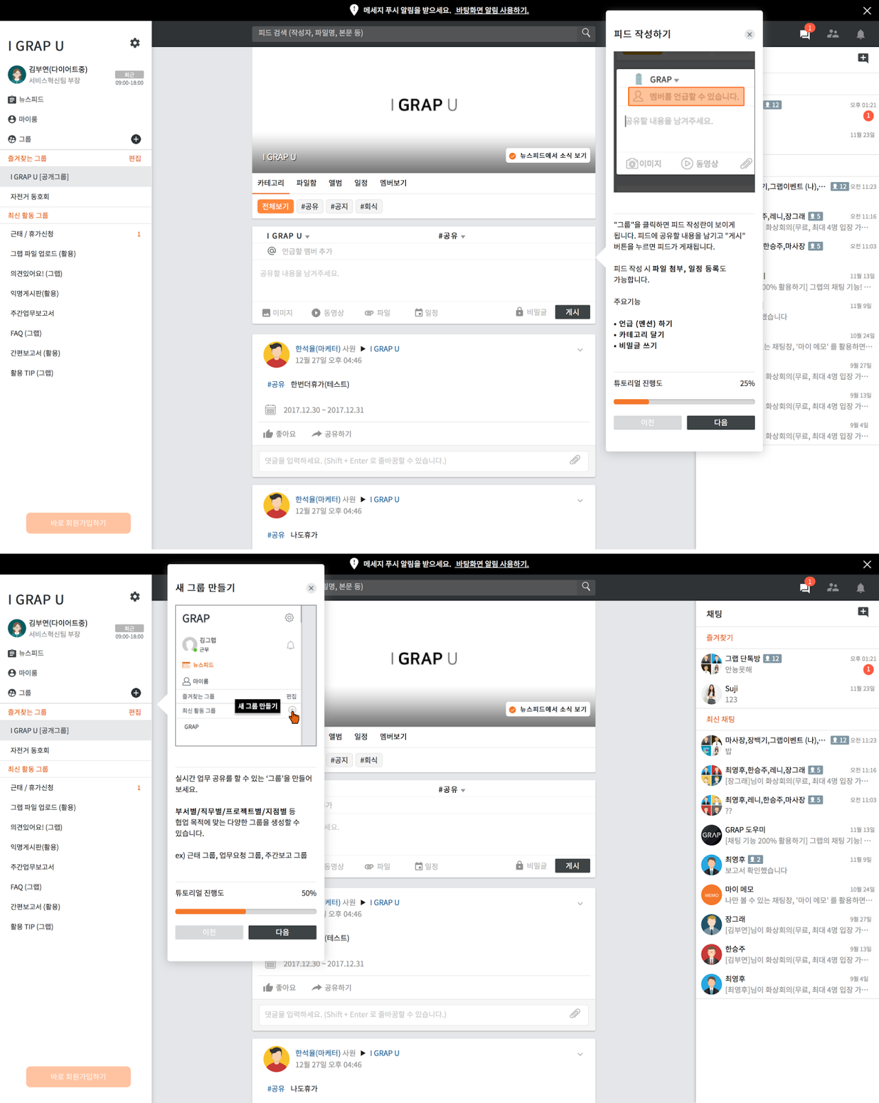 이러한 공간은 페이스북과 같은 익숙한 UI 및 피드를 통해서 보다 친숙하고 편리하게 접근하고 활용할 수 있기 때문에 업무용 메신저, 기업용 메신저라고 해서 어렵고 난해하거나 복잡하지 않아서 큰 장점을 지니고 있다.