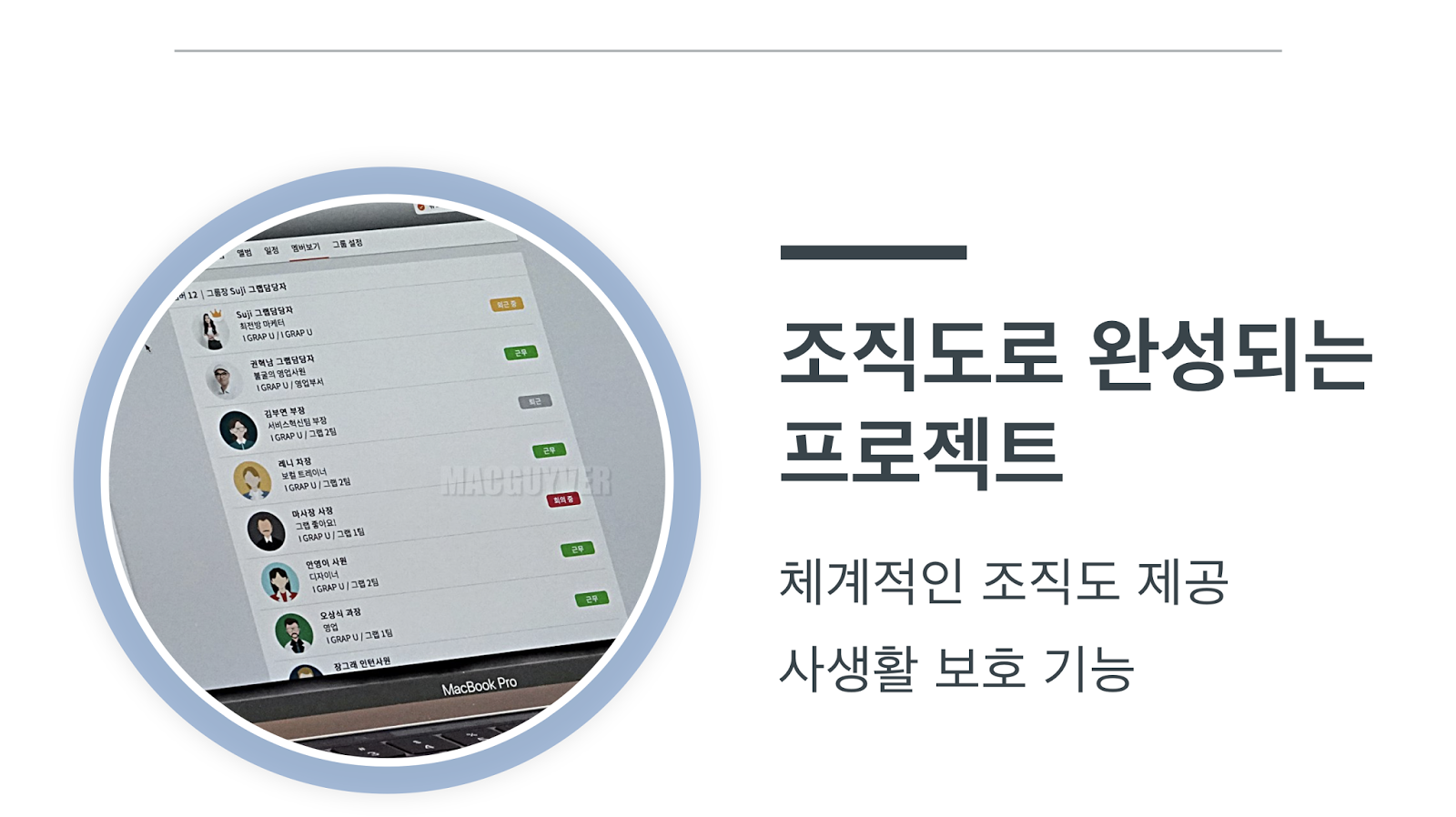 이러한 조직도를 기반으로, 앞서 소개된 그룹 및 메신저 기능을 활용하게 된다면 팀원에 대한 이해도도 높아질 뿐 아니라 업무의 효율성까지 높일 수 있고, 오직 업무 및 프로젝트에 관련해서만 기록들이 남기 때문에 프로젝트의 완성도를 높일 수도 있다.
