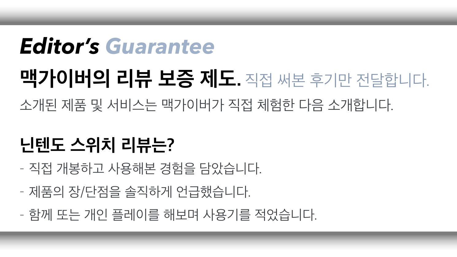 부담 없이 게임을 즐기고 싶다면 닌텐도 스위치를 선택하고 사용해보는 것도 좋을 것 같다. 물론, 어느새인가 점점 늘어나는 게임 타이틀과 액세서리를 보면서 카드 명세표가 묵직해질지도 모르지만. - MACGUYVER.