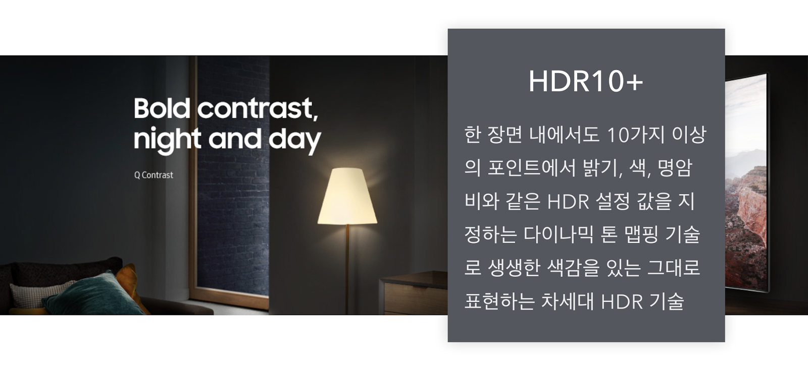 그렇다면, HDR과 HDR10+(HDR10플러스)는 어떤 점에서 다른 것일까? 우선 HDR 기술은 밝은 부분은 더욱 밝게 표현하고, 어두운 부분은 더욱 어둡게 보정하는 ‘명암비 향상’ 기술을 말한다. 그래서 색상이 더욱 선명하고 생생하게 전달되는 것이다.