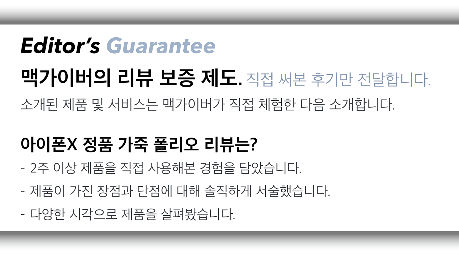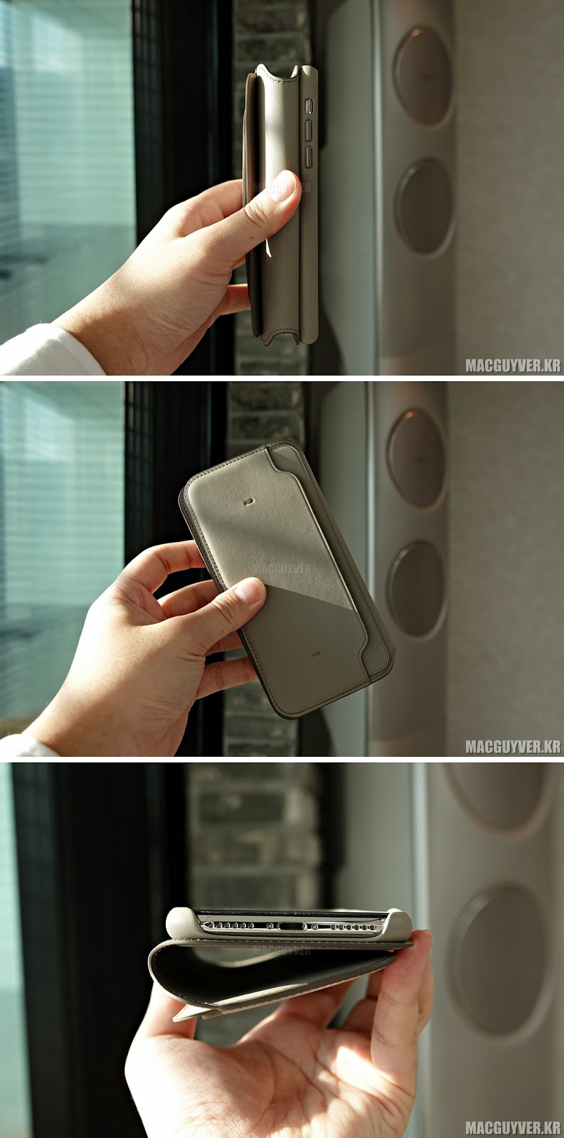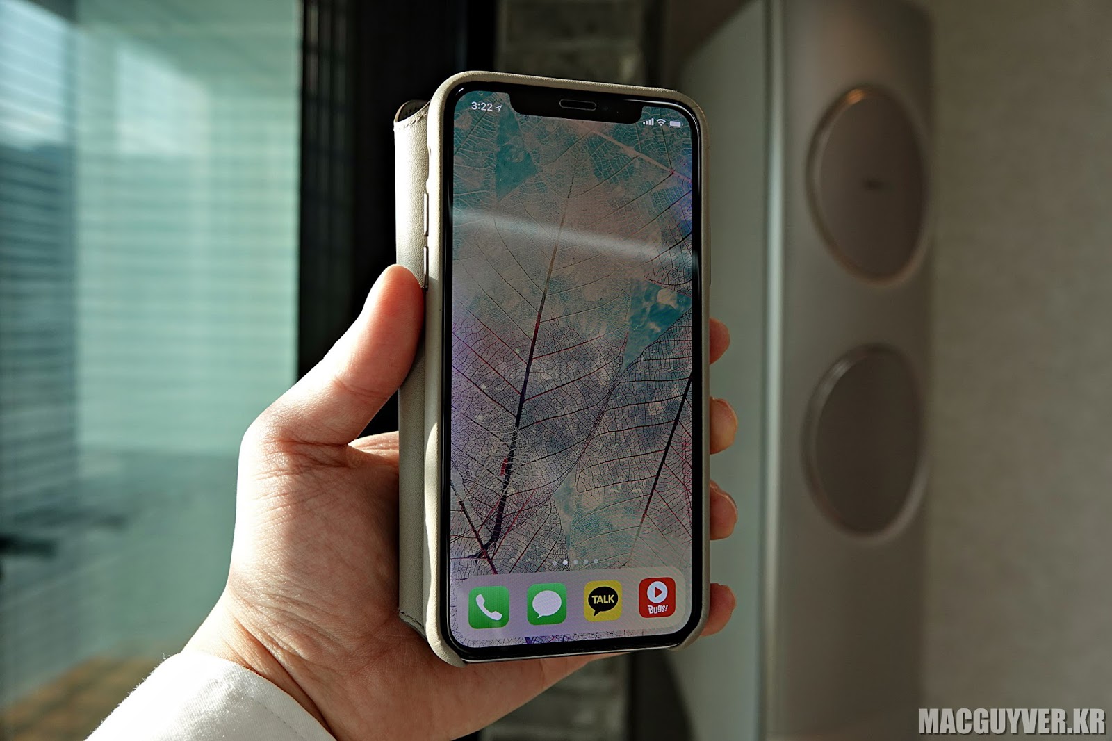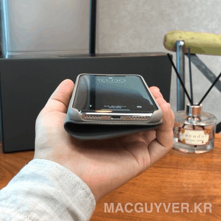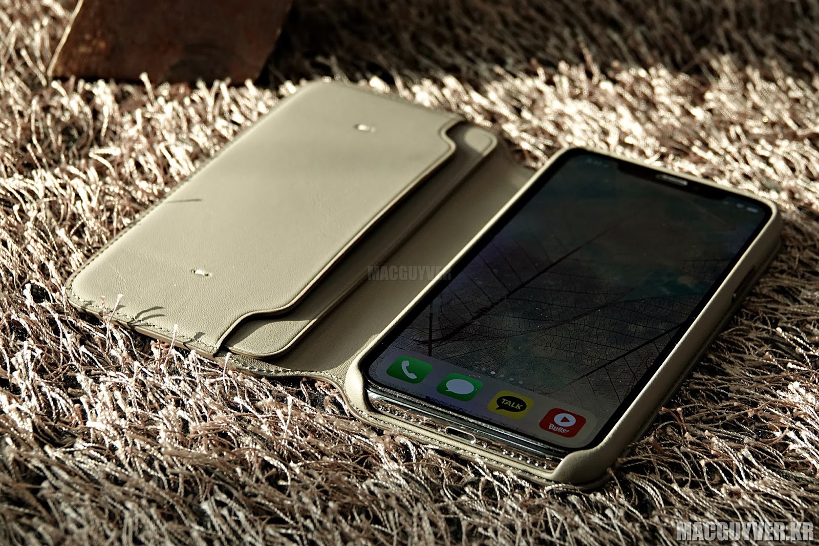 그러나 카드 수납 기능이나 커버를 열고 닫는 것만으로 화면을 켜고 끌 수 있는 기능성, 고급스러운 컬러감 및 손맛까지 고려하자면 아이폰X을 고급스럽게 사용하려는 분들에게 꼭 적합한 케이스가 아닐까 싶었다. - MACGUYVER.