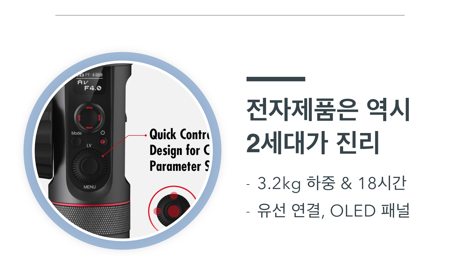 또한 유선 연결로 카메라와의 연동성을 높이는 것도 가능한데, 리얼 타임 팔로우 포커스라는 기능을 활용해볼 수도 있고, OLED 패널을 통해 카메라의 현재 조건을 즉시 확인하는 것도 가능하며, 짐벌의 다이얼로 카메라의 옵션을 세팅할 수도 있다.