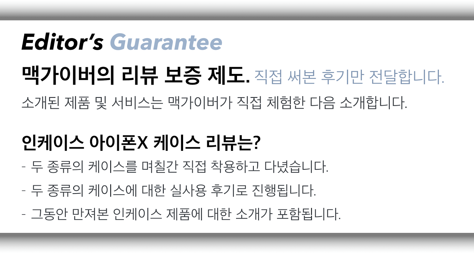 아쉬운 점들도 있었지만 아이폰X에 준수한 옷을 입혀주고 싶다면, 인케이스 케이스를 고민해보는 것도 좋을 것 같다. - MACGUYVER.