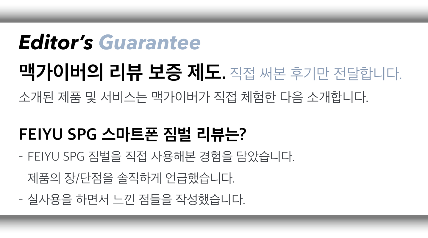 그리고 FEIYU 테크가 짐벌과 관련해 기술력이 부족한 브랜드가 아니기 때문에 저렴한 가격으로 스마트폰 3축 짐벌을 경험해보고 싶다면, 한 번쯤 고민해보는 것도 나쁘지 않을 것 같다. - MACGUYVER.