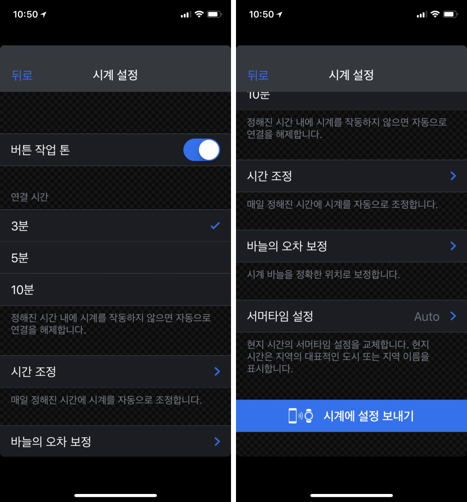 ✎ 설정을 통해서 버튼 작업 톤을 켜거나 끌 수 있었고, 연결 시간 설정 및 시간 조정, 바늘의 오차 보정, 서머타임 자동 설정까지도 모두 가능했고 바로 시계에 설정을 보낼 수 있었다.