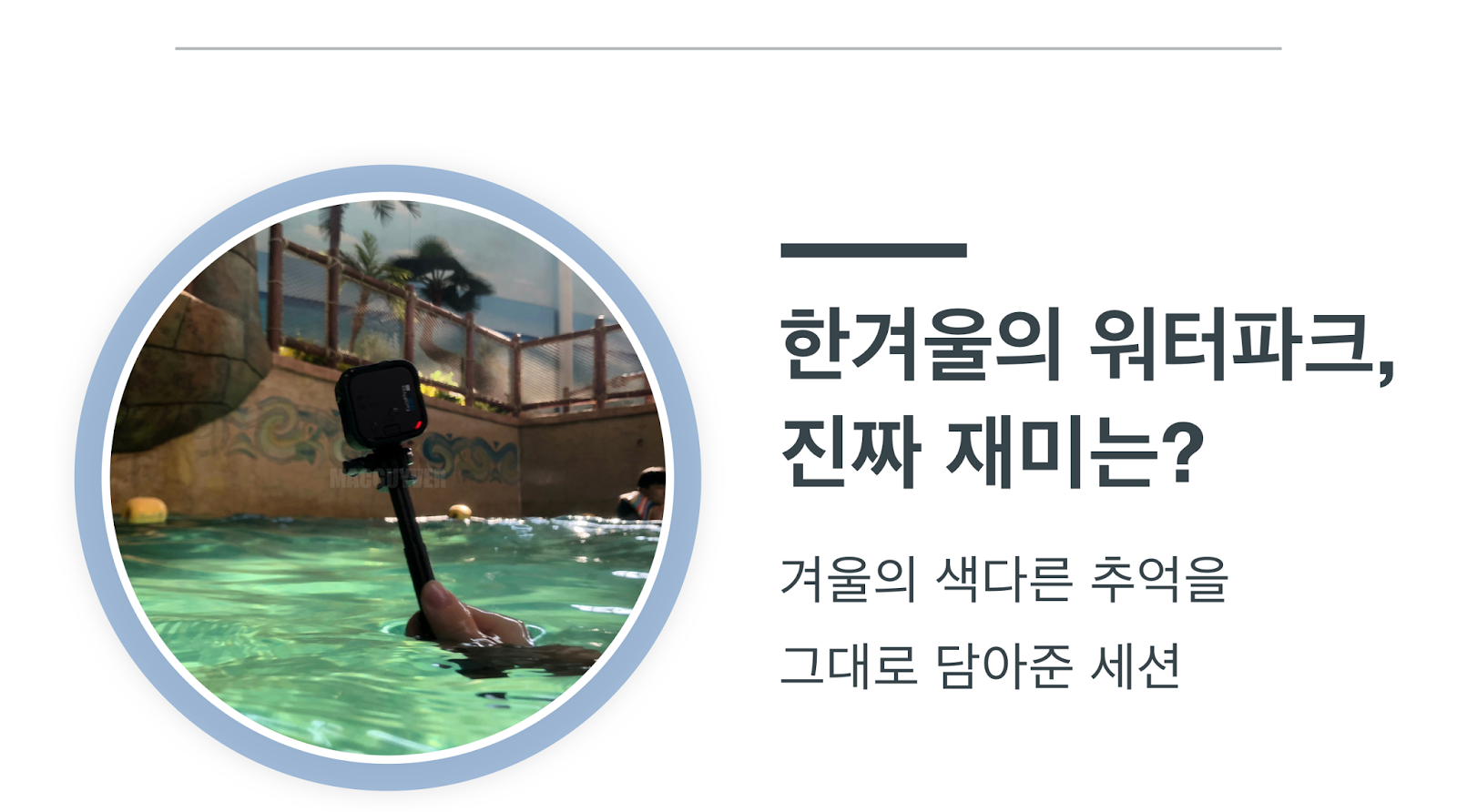 그렇다면, 한겨울의 워터파크를 담아본 고프로 히어로5 세션의 맛은 어땠을까? 세션과 함께한 쇼티, 그리고 즐거운 지인들과의 워터파크의 현장 속으로 떠나보기로 했다.