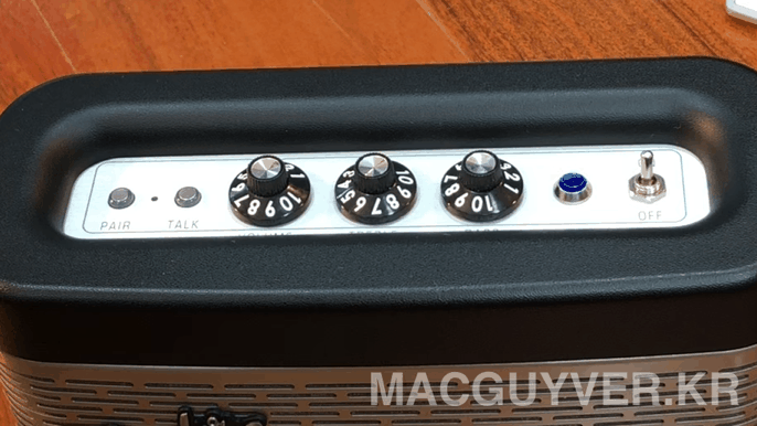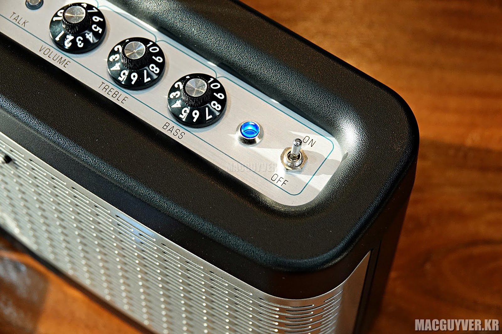 A. 상단은 푸른색 LED를 중심으로, 중앙 부분에 VOLUME, TREBLE, BASS를 조절할 수 있는 노브가 있다. TREBLE을 조절하게 되면 고음을 적당히 절제할 수 있고, BASS를 통해서는 중저음을 더하거나 가볍게 만드는 것도 가능하다.