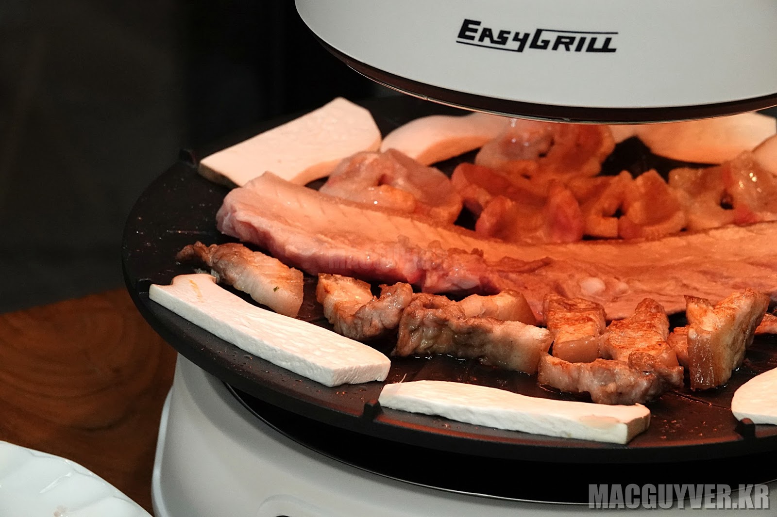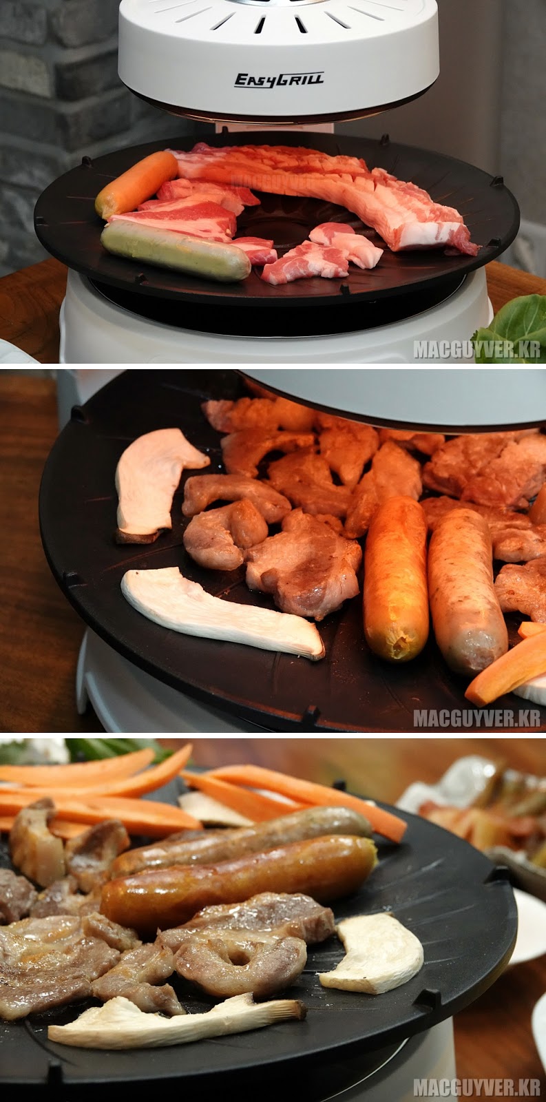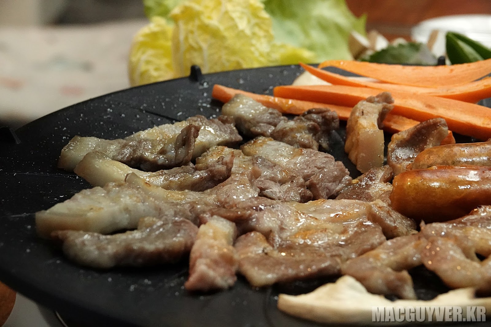 A. 고기를 굽고 있다는 것을 잊게 만들 정도로 정말 조용하게 고기가 익혀졌고, 중앙 부분에는 고기를, 테두리 부분에는 버섯과 같은 채소를 올려두면 꼭 알맞은 만큼 조리가 되어서 함께 먹기에 더없이 좋았다.