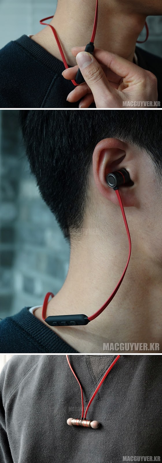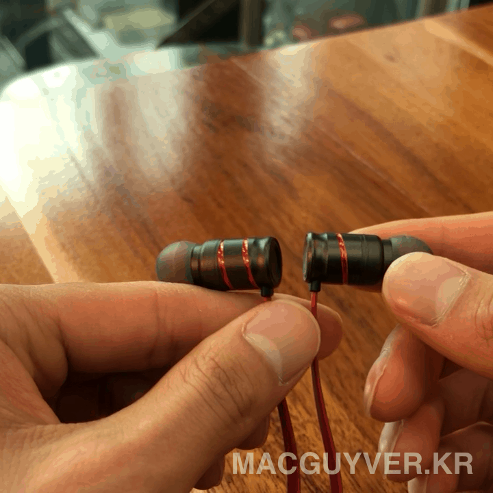 5) 자력이 강하지는 않지만 마그네틱 방식으로 두 이어버드를 고정해둘 수 있어서 음악을 듣지 않을 때도 비교적 안심하고 귀에서 빼어둘 수 있다.