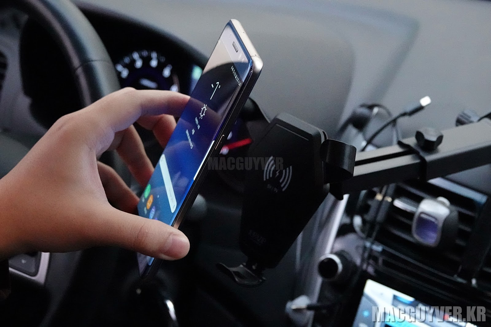 A. 맞다. 주파집 차량용 고속 무선 충전기는 중력을 활용해서 스마트폰이 가지고 있는 무게를 통해서 툭 놓으면 착 하고 바로 고정되는 것을 볼 수 있는데, 위쪽에 있는 고정 홀더가 자연스럽게 폰을 잡아줘서 안정적으로 거치가 가능했다.