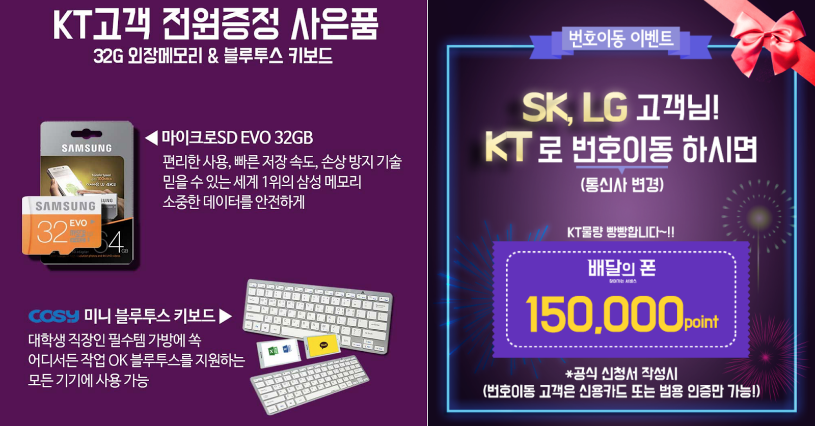 그리고 KT 고객에 한해서는 삼성 마이크로 SD EVO 32GB와 COSY 미니 블루투스 키보드가 추가 증정되고, KT로 번호이동하는 경우 15만 포인트가 추가 제공된다고 하니 참고하자.