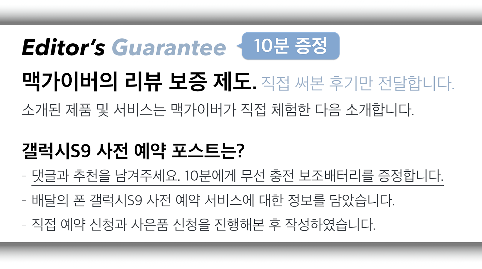 하지만 단통법 아래에서도 합리적인 조건으로 가장 빨리 갤럭시S9을 만나보기 원하는 사람이라면, 배달의 폰 사전 예약 혜택을 기준으로 다른 서비스들을 비교하는 게 시간을 절약할 수 있는 현명한 방법이지 않을까 싶다. - MACGUYVER.