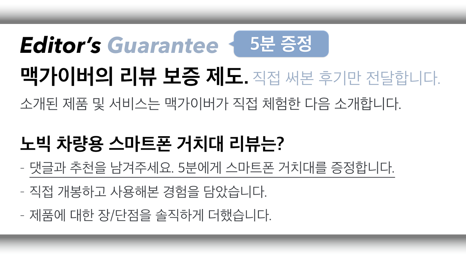 오늘 살펴본 노빅 차량용 스마트폰 거치대는 1만원 초반대 가격으로 만나볼 수 있을 뿐 아니라 1,000원 할인까지 제공되기 때문에 가성비가 매우 뛰어나다. 여느 편의점이나 휴게소에서 쉽게 구입하는 제품들도 2~3만원대라는 점을 감안하자면 가격적인 장점이 큰 것이다.