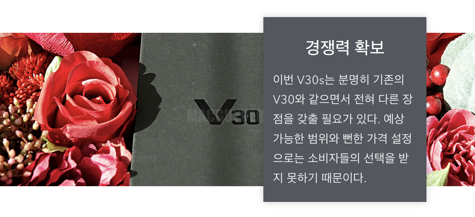 우선, 기존에 출시된 V30를 구입한 소비자들이 상대적인 박탈감이나 외면을 느끼지 않도록 해야 하고, 동시에 갤럭시S9 시리즈와 비교해서 열세인 스펙을 넘어서는 다른 장점을 제대로 어필해야 하는 것이다.