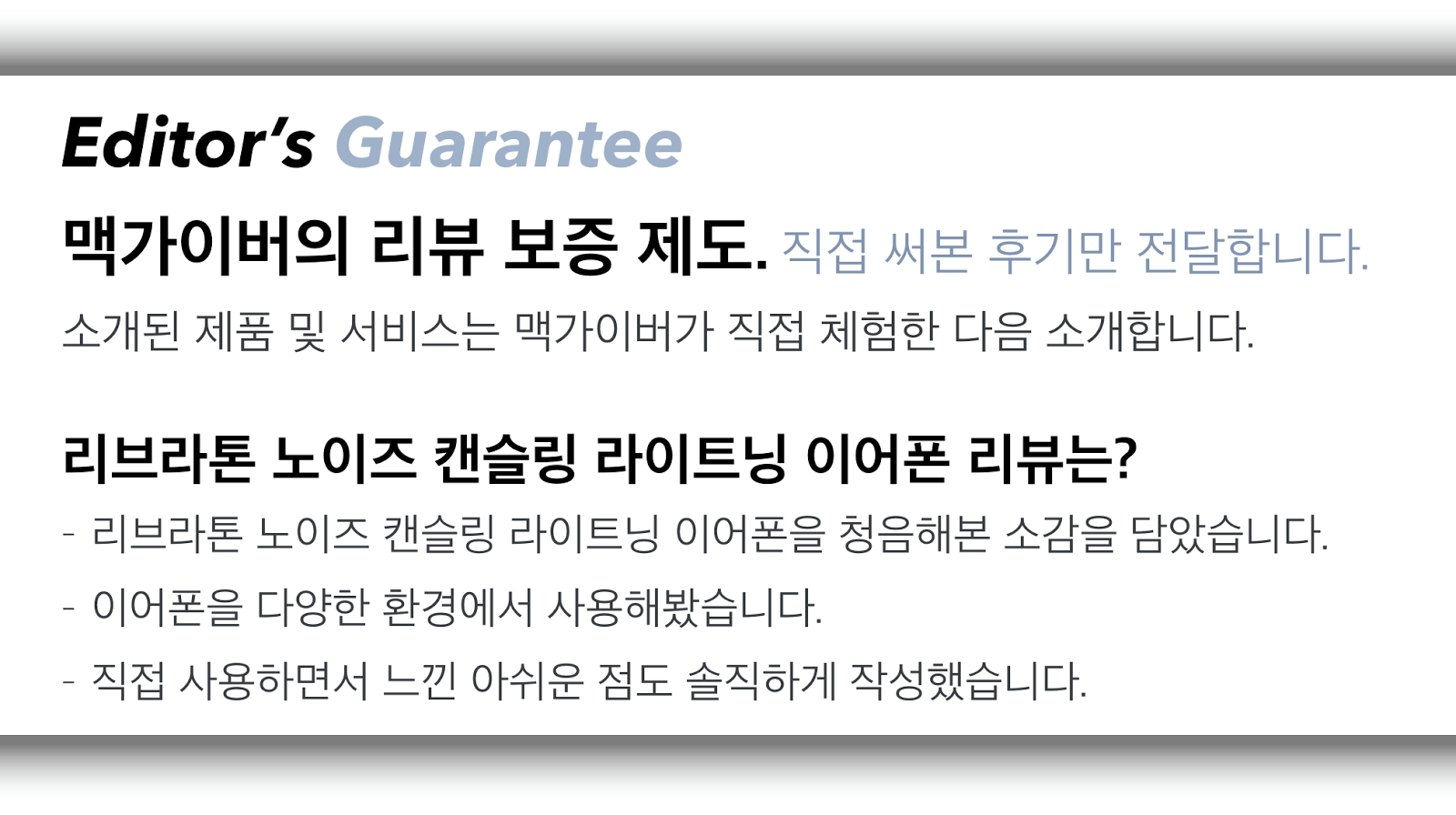 특히나 스타일도 고급스러웠고 디자인도 마음에 쏙 들었기 때문에, 다른 노이즈 캔슬링 제품 대비 훨씬 가성비가 뛰어나면서도 소음 제거 기술도 뛰어났기 때문에 리브라톤 노이즈 캔슬링 라이트닝 이어폰은 분명 ‘고음질, 소음 제거, 편의성’ 모두를 잡은 제품이 아닐까 싶었다.