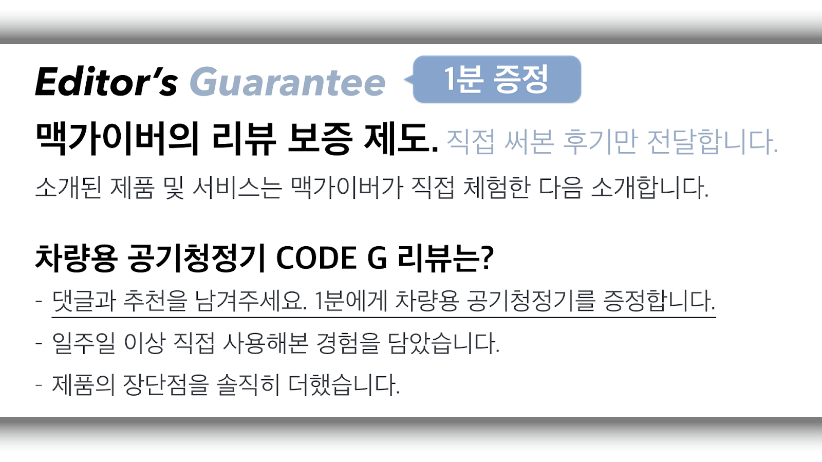 가성비까지 더하면서 7만원대로 만나볼 수 있게 된 CODE G 차량용 공기청정기를 통해서 고급스러운 디자인과 뛰어난 성능을 모두 활용해볼 것을 추천한다. - MACGUYVER.