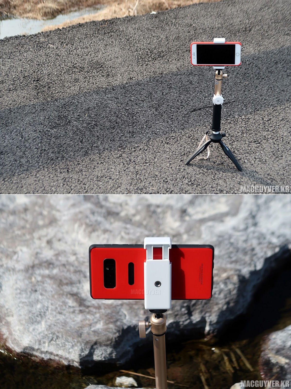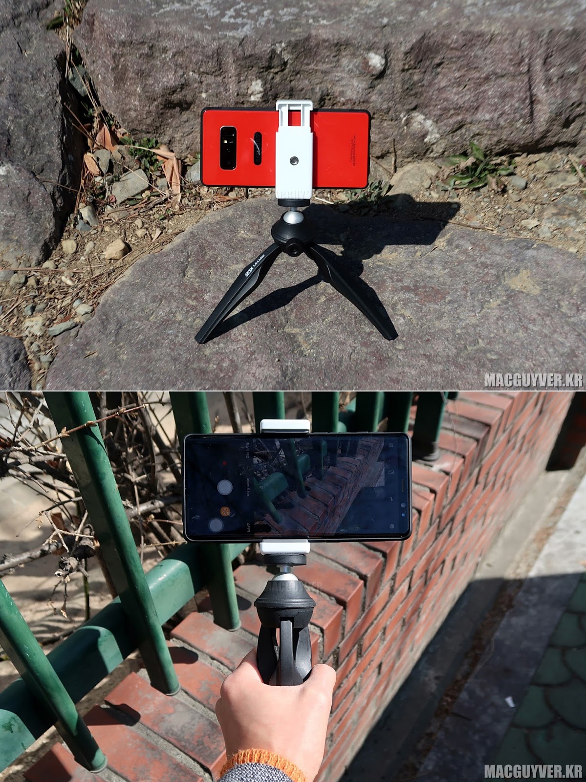 또 미니 삼각대가 볼헤드 방식이기 때문에 지면이 평평하지 않더라도 어느 정도 균형과 수평을 맞출 수 있고, 세로 거치 역시 가능하다. 세로 거치는 1-2단으로만 사용할 것을 추천한다.