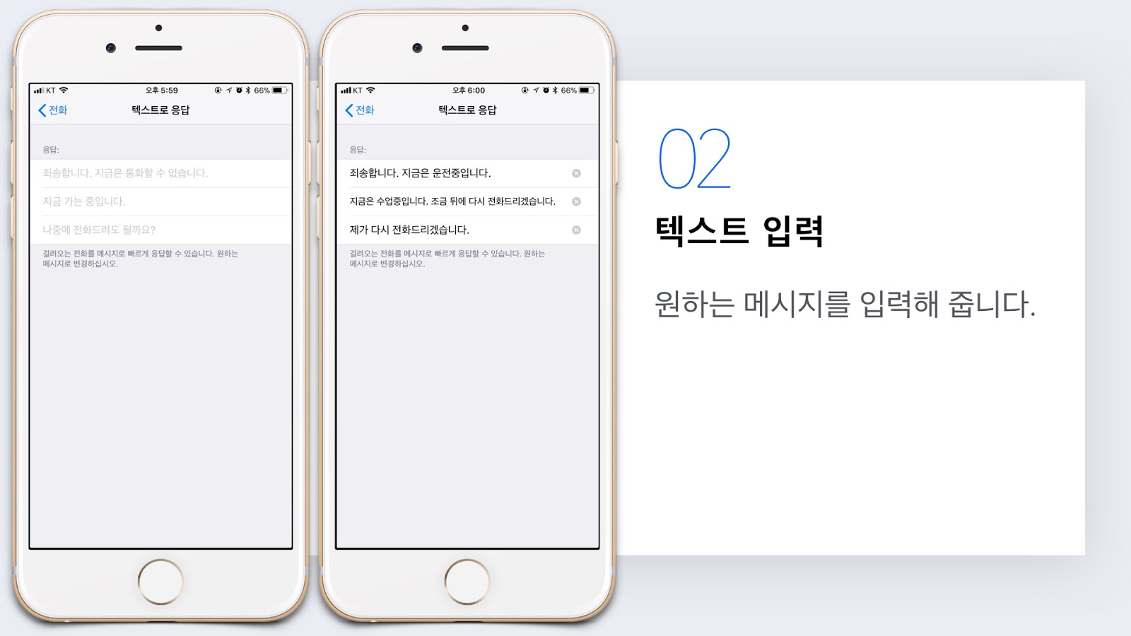 운전중이라면 ‘운전중입니다’라는 텍스트 문구를 넣어두시거나, 학생이라면 ‘수업중입니다’라는 문구를 넣어두시면 더욱 유용하게 사용해 보실 수 있을 것 같네요.