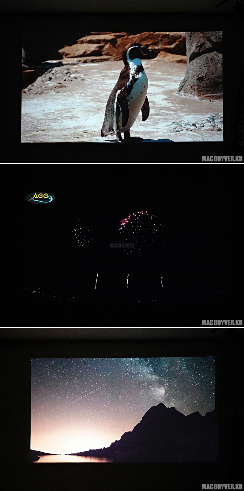 투사 화면의 경우는 조명이 켜질 경우에는 당연히 다소 어두워지기는 했지만 색상을 잃지 않아서 여전히 보기에는 문제가 없었고, 완전히 암흑과 같은 밤이 되지 않아도 저녁 정도라면 문제없이 생생하고 밝은 화면을 볼 수 있었다.