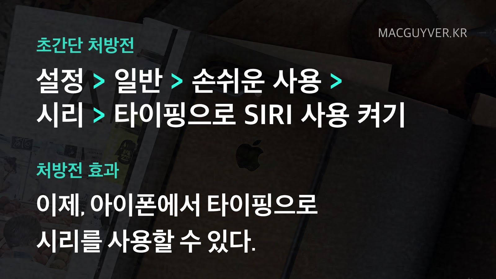 하지만, 도서관처럼 소리를 내기 곤란한 공공장소에 있거나, 목이 아파 목소리를 내기가 힘든 상황에서 시리를 불러낼 수는 없었다. 그렇다면 이런 상황에서 음성이 아닌 다른 방법으로 시리와 대화할 수는 없을까?