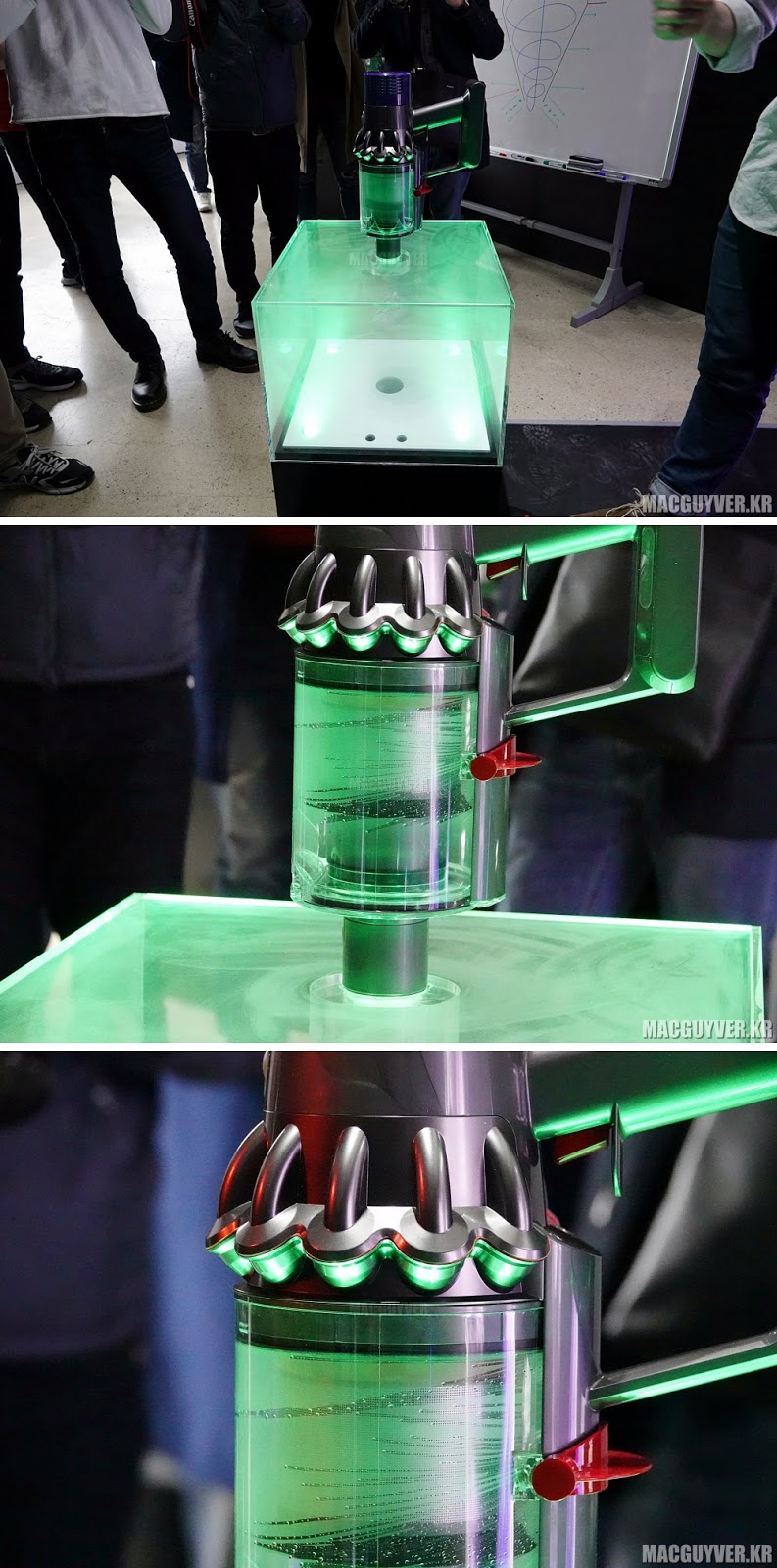 다양한 설명이 이어진 이후, 직접 제품을 체험할 수 있는 기회가 있었는데, 여기서는 놀라운 극한 실험들이 계속 이어졌다. 우선 ‘스모크 테스트’를 통해서 먼지와 공기를 완벽하게 분리하는 싸이클론 기술 및 필터 밀폐 시스템이 제대로 구축되었는지를 확인할 수 있었다.