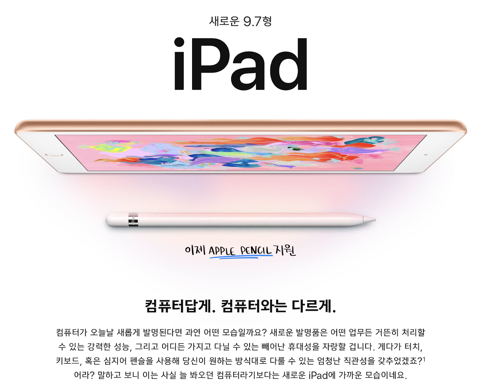 집에서 굴리고 있던, 혹은 바꿀 이유가 없어서 계속 사용해왔던 기존의 아이패드를 바꾸고 싶게 만드는 완전히 달라진 아이패드가 갖고 싶은 이유는 아마도 애플펜슬과 가격의 조합 때문일지도 모르겠다. - MACGUYVER.