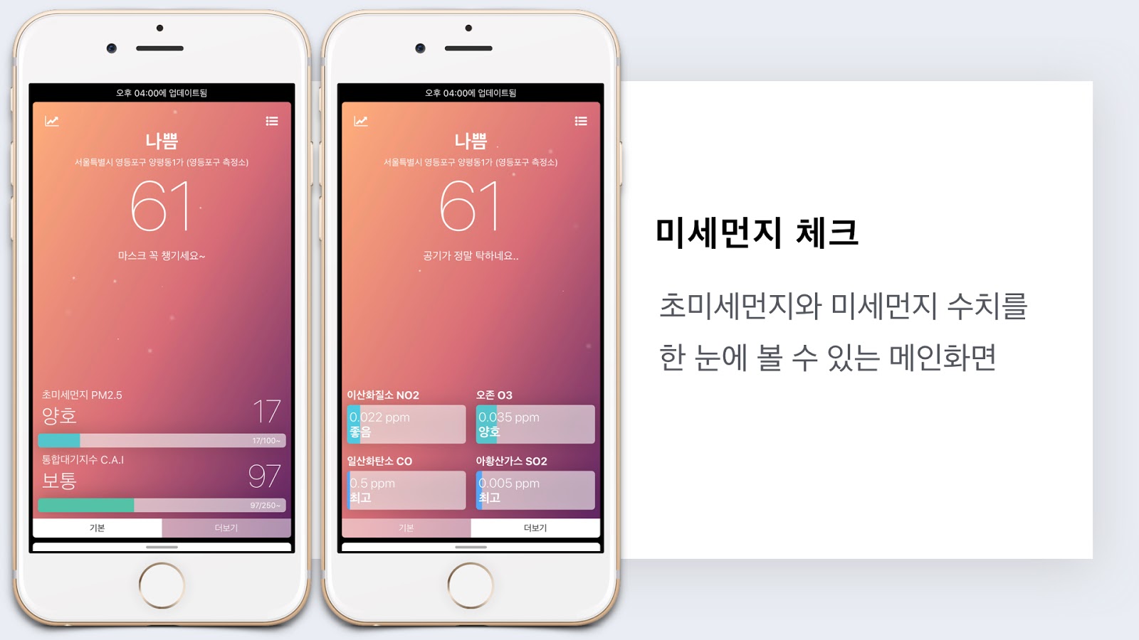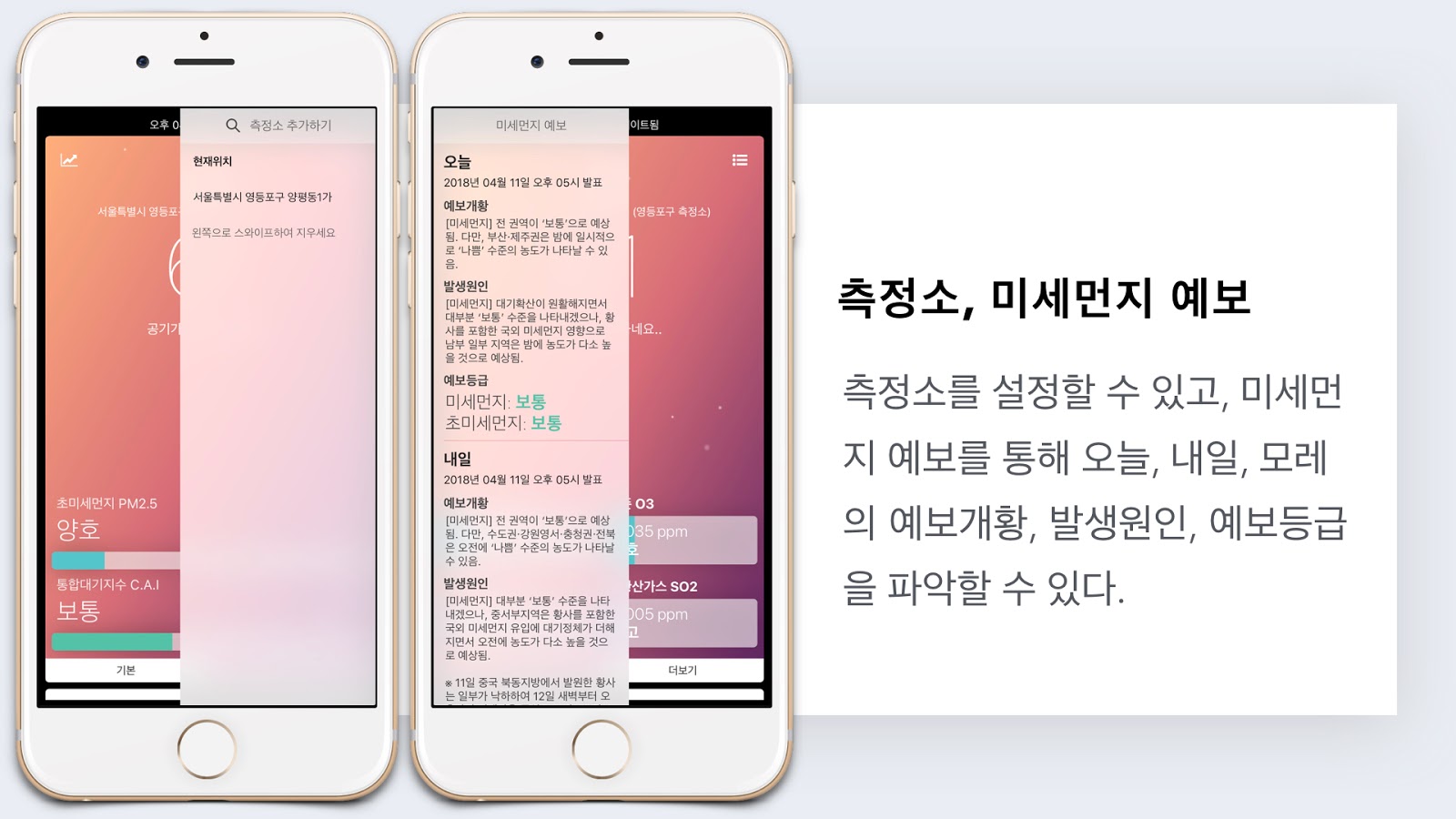 미세먼지 예보개황과 예보등급, 발생원인, 그리고 내일과 모레의 예보까지 미리 알 수 있어 외출 계획을 하는 사람들에게 빠르고 직관적인 정보를 전해준다. 또한 전국의 미세먼지와 초미세먼지 농도도 한눈에 파악할 수 있었기 때문에 더욱 편리한 사용이 가능하다.