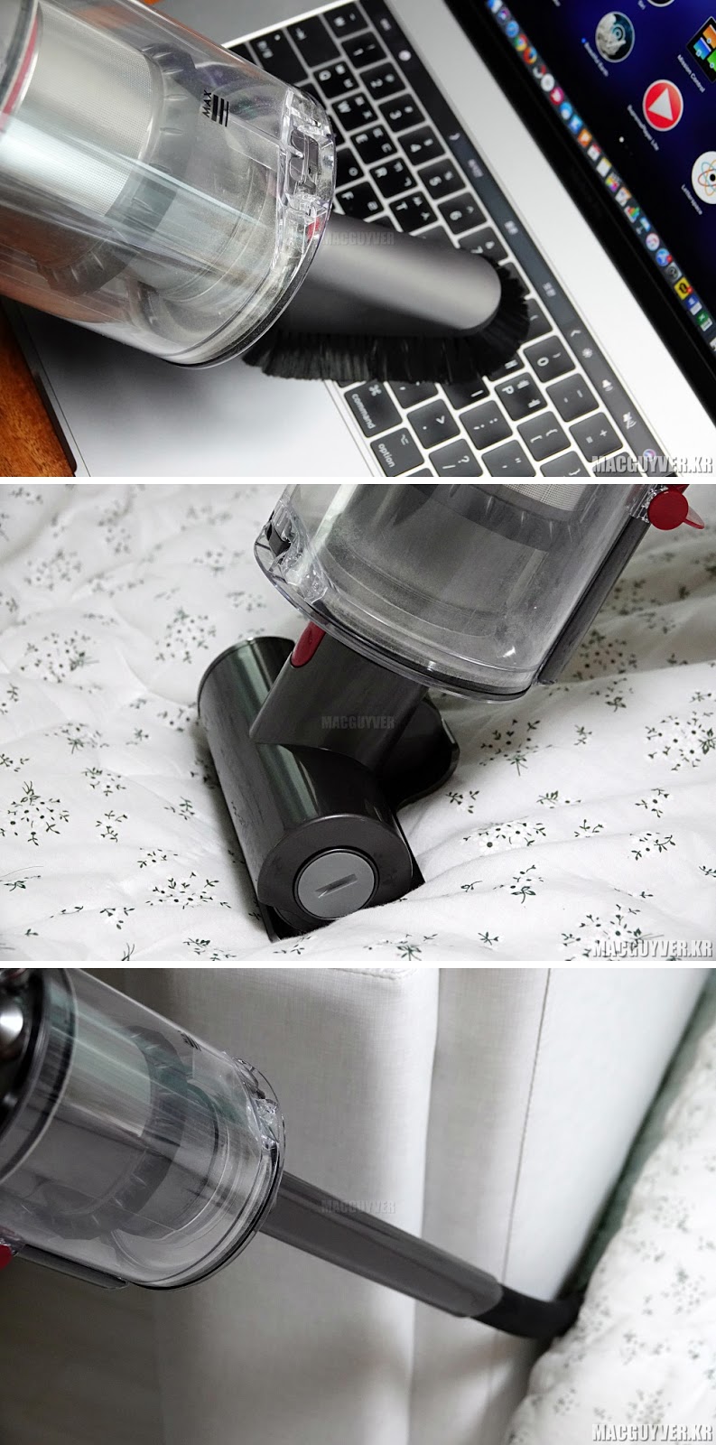 직접 활용해본 다이슨 싸이클론 V10 무선청소기는 편의성이 상당히 높아졌는데, 먼지통을 비우는 일도 앞으로 쑥 내밀면 끝이 났고, 여러 툴을 교체하는 일 역시 너무나 부드러워서 강력한 결착력과 간편한 분리 방식이 더해진 장점을 제대로 체감해볼 수 있었다.