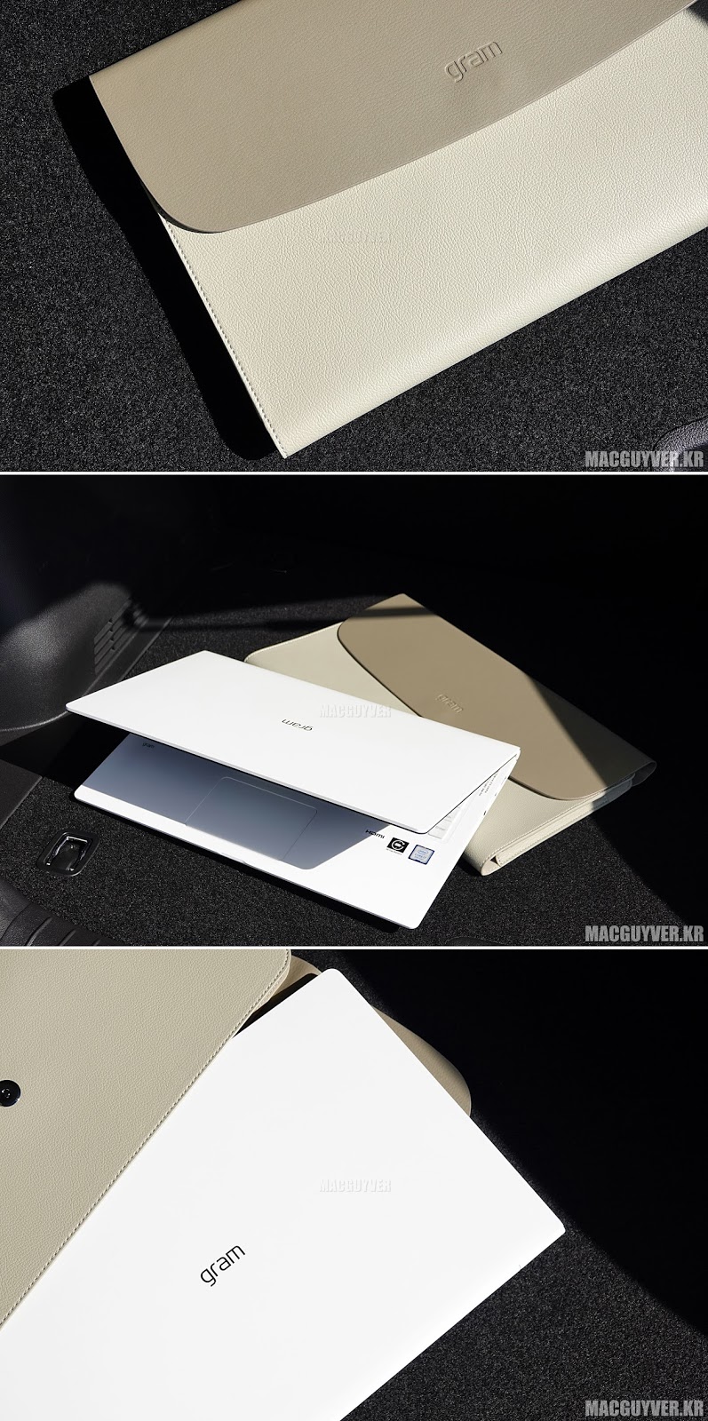 이 파우치는 세대를 거듭하면서도 거의 변화가 없는데, 아쉬움이라면 완전한 화이트 컬러의 LG 그램 15인치 2018 (15Z980-GA70K) 모델과 약간은 맞지 않아 보인다는 점이 있었다.