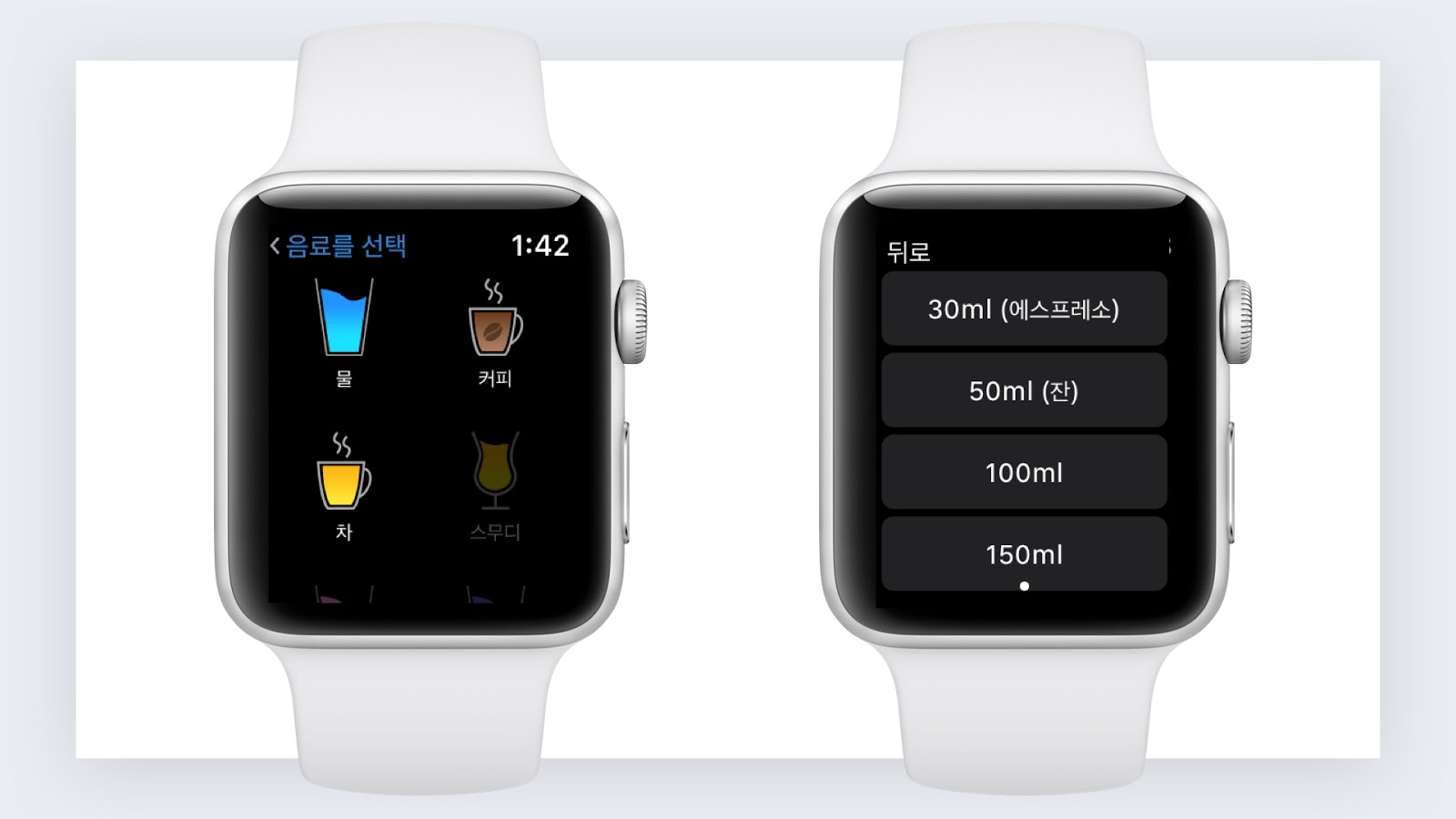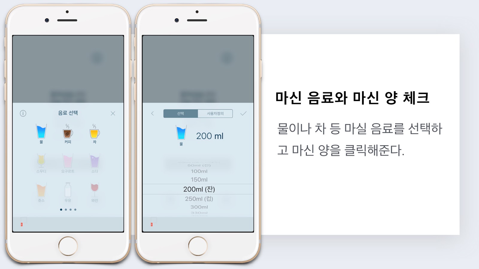 ✎ 무료 버전에서 활용이 가능한 '물, 커피, 차' 3가지 종류. 가볍게 눌러서 용량을 기입하면 기록을 끝낼 수 있다.