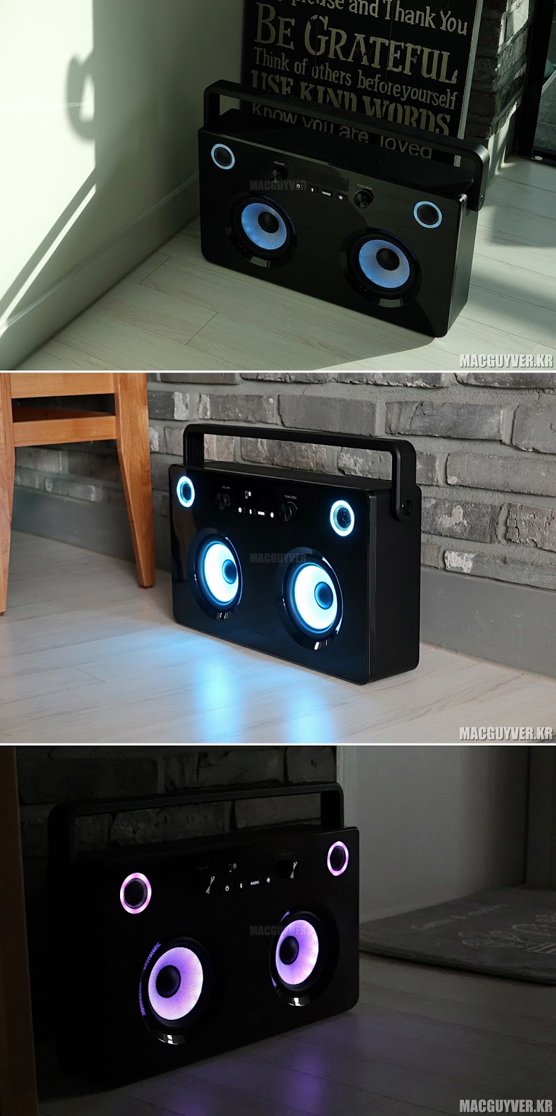 스펙트라붐 LED 블루투스 스피커는 피아노 블랙 붐박스 스피커로서 80년대의 감성을 그대로 더하고 있다.