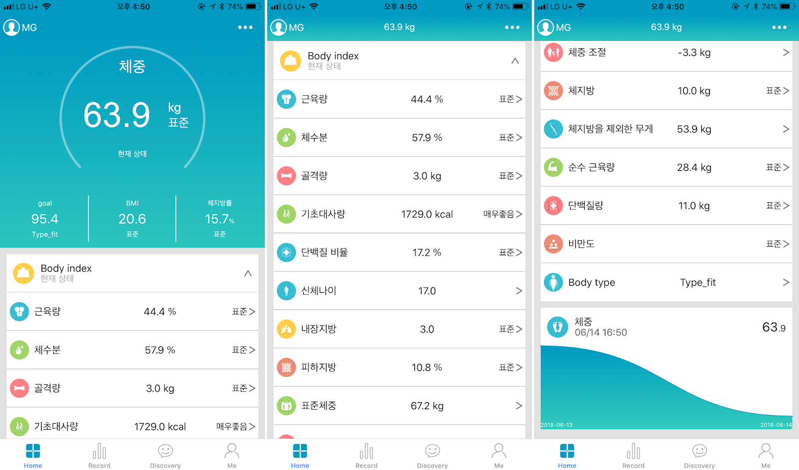 우선 체중을 시작으로, 신장 대비 체지방 지수를 볼 수 있고, 기초 대사량과 근육량, 체지방, 체수분 수치도 보여준다.