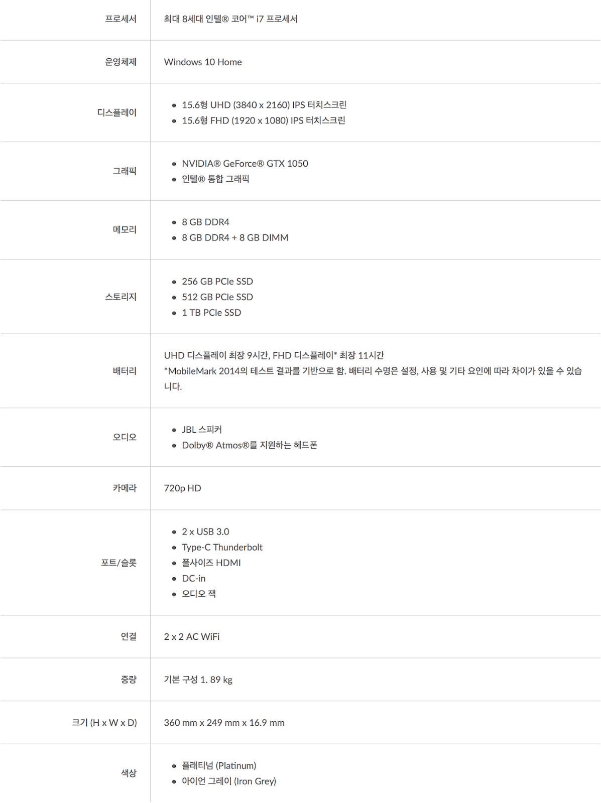 또 8세대 인텔 코어 i7-8550U를 품고 있는데, 저전력 U라인업이긴 하지만, 맥북 프로나 게이밍 노트북에 탑재되었던 i7-7700HQ 모델과 성능이 자주 비교된다. 자세한 벤치마크 비교는 [바로가기]를 참고하자.