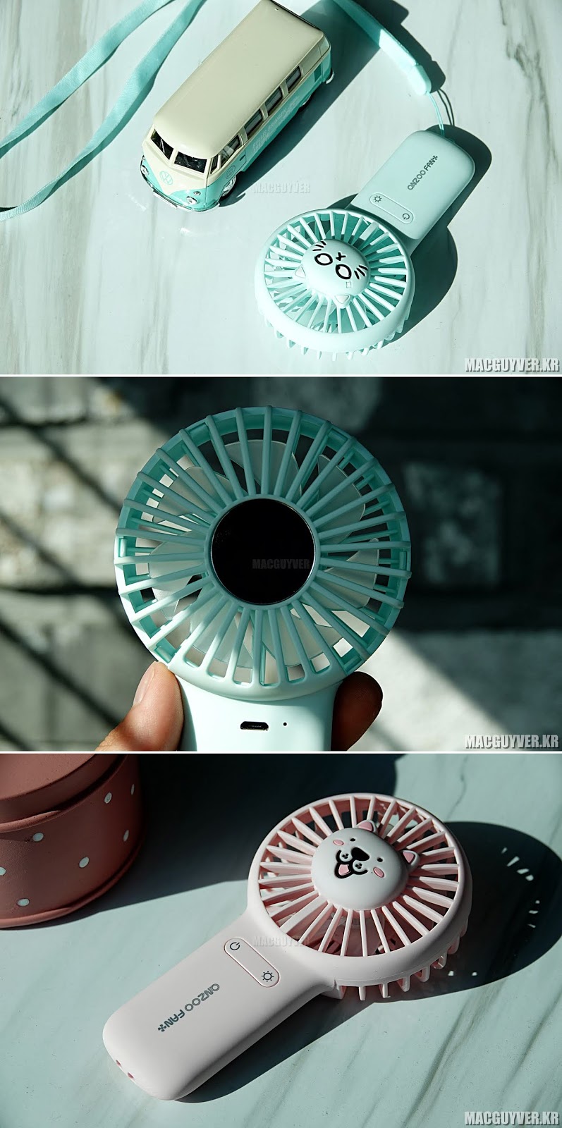 ✎ 전면의 귀여운 캐릭터와 파스텔톤 컬러로 자꾸만 눈길이 갔다. 안전한 배터리 셀 사용과 LED 무드 라이팅 기능으로 어디서든 재미있고 시원하게 사용해 볼 수 있었다.