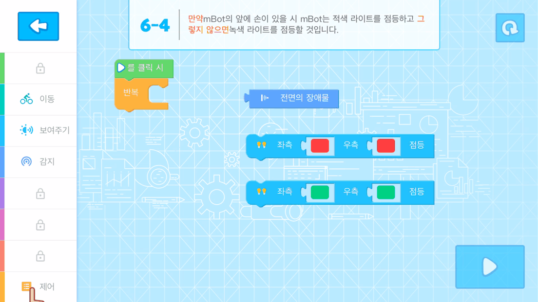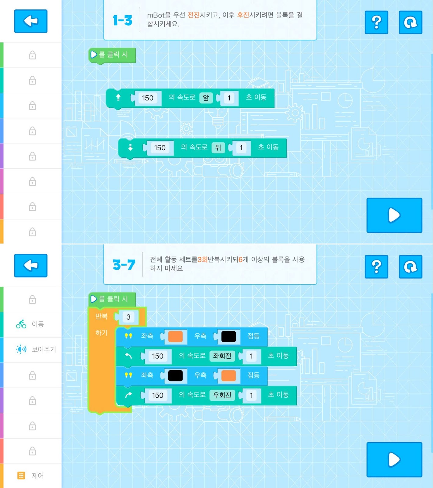 시키는 대로 블록을 맞추고 재생 버튼을 누르면 로봇이 움직인다. 예상과 달리 초반엔 굉장히 쉬었고, 무언가 배운다는 느낌보다는 그냥 게임을 하듯 문제를 풀어나갔다.