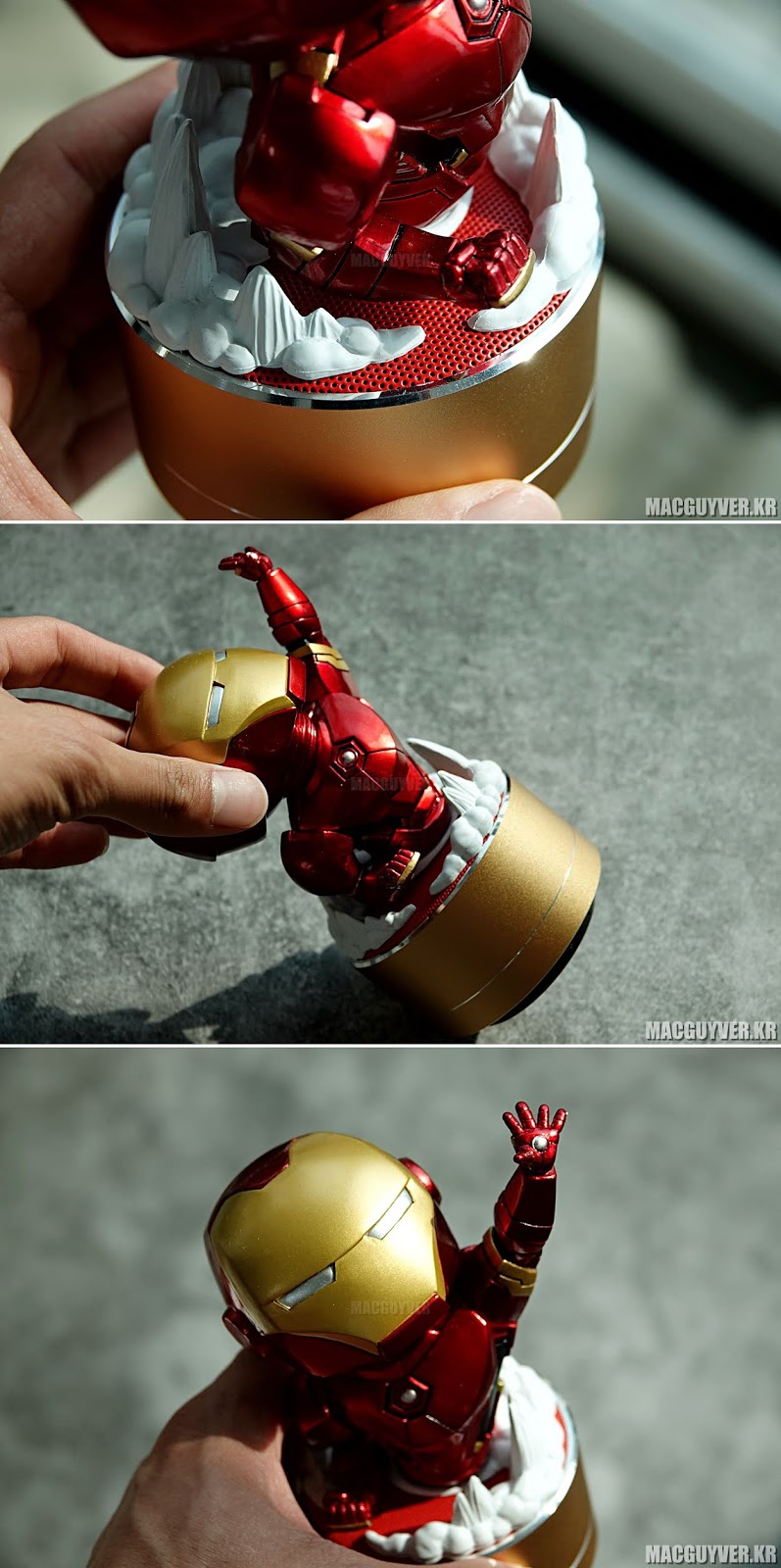 ✎ 500대 한정 판매중인 아이언맨 스피커는 285g의 제법 묵직한 무게감과 단단한 내구성을 느낄 수 있다. 음악 재생시 화이트 컬러의 LED가 반짝인다.