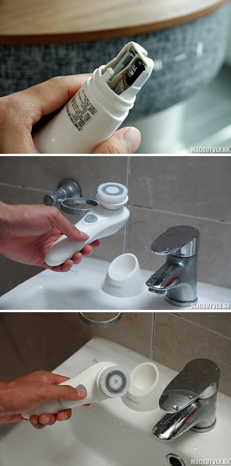 ✎ 브러쉬에 물과 클렌징 제품을 묻힌다음 작동시켜 얼굴에 부드럽게 문질러주면 클렌징이 된다. 사용이 끝나면 거치대에 세워둘 수 있는 브러쉬 진동클렌저