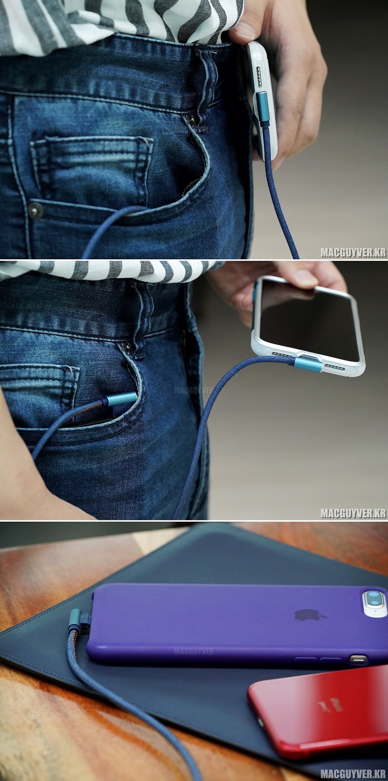 기본으로 제공되는 아이폰 케이블을 사용하면서 꺾임이나 단선을 많이 겪어 불편함을 느꼈지만, 데님 재질만큼이나 특이한 ‘ㄱ’자 형태의 단자는 단선의 위험을 겪지 않게 해줘서 만족스러움을 더했다.